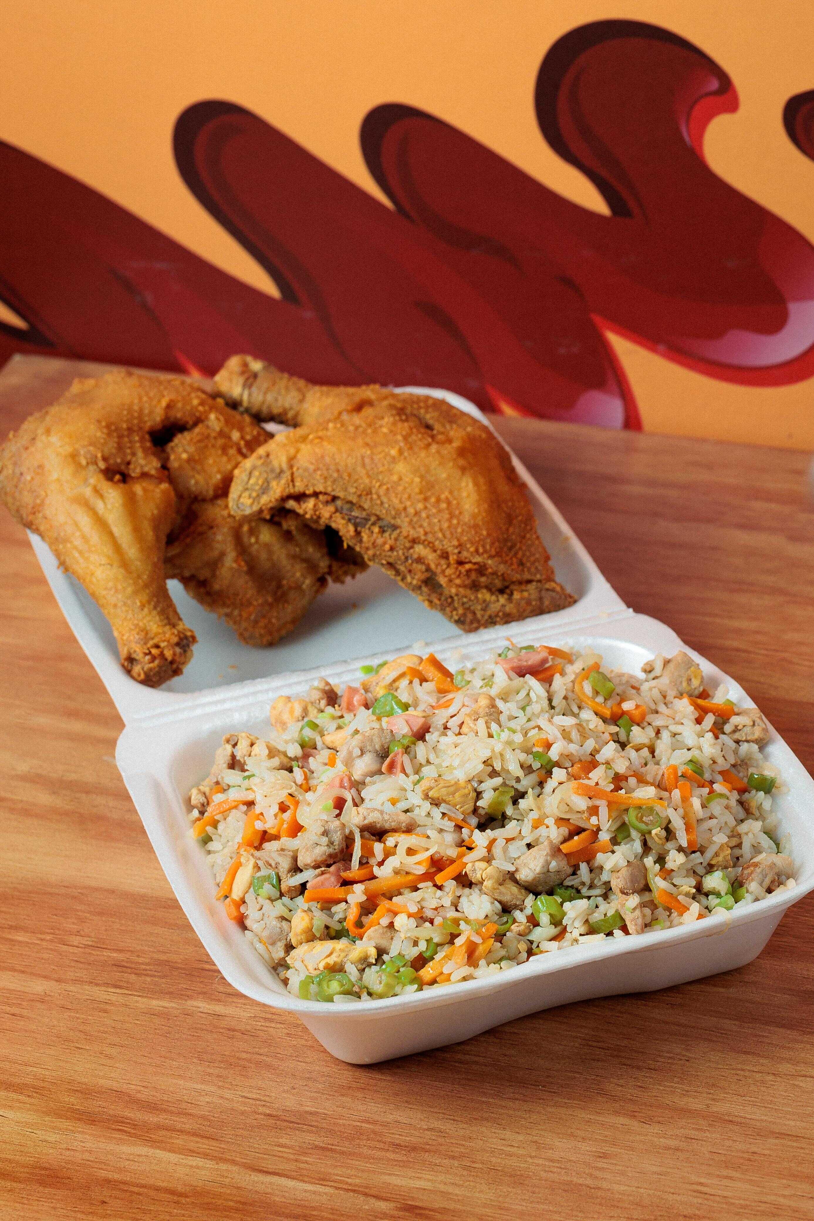 Delicioso Arroz Mixto de 900gr, con cuatro presas de pollo (muslo o contramuslo), 30gr de papa amarilla y una gaseosa de 1.5 LT.