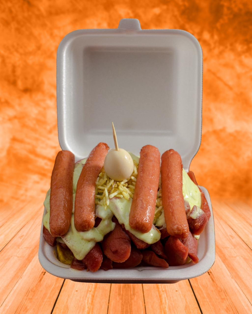 Salchicha, papa, queso, ripio, ranchera, tocineta, huevito de codorniz y salsa a elegir.