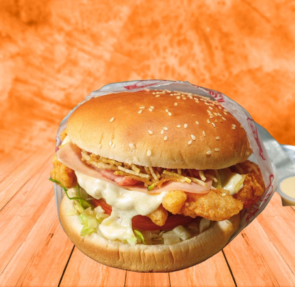 Carne de res 130 g, pechuga apanada 120 g, doble queso, tocineta, jamón de pierna, lechuga, tomate y cebolla.