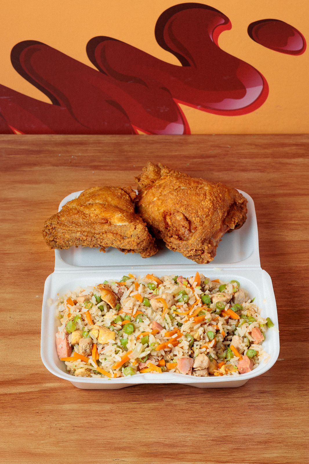Delicioso Arroz Mixto de 280gr, con una presa de pollo (muslo o contramuslo), 30gr de papa amarilla y una gaseosa de 250 ml.