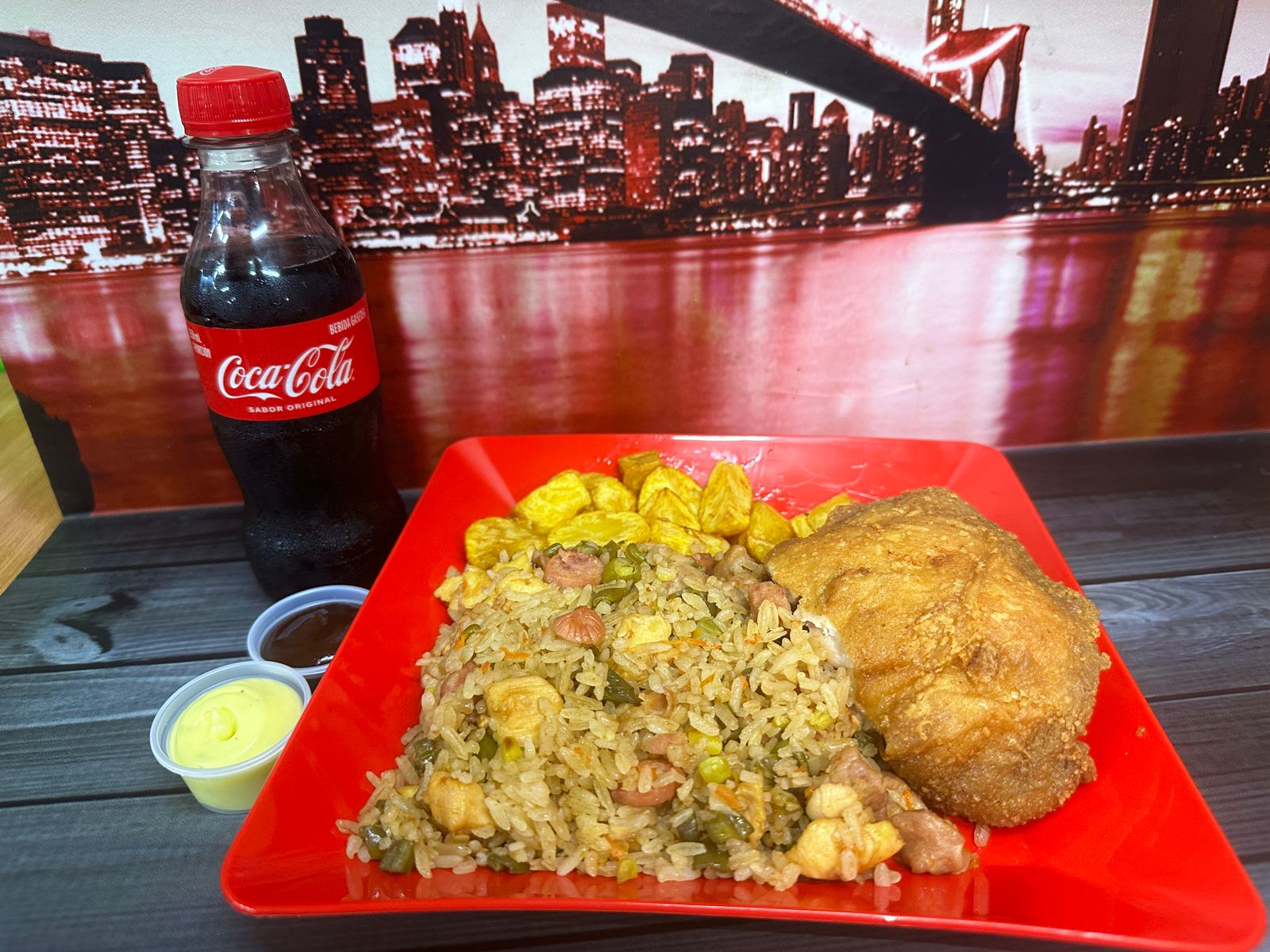 Delicioso Arroz Mixto de 900gr, con cuatro presas de pollo (muslo o contramuslo), 30gr de papa amarilla y una gaseosa de 1.5 LT.