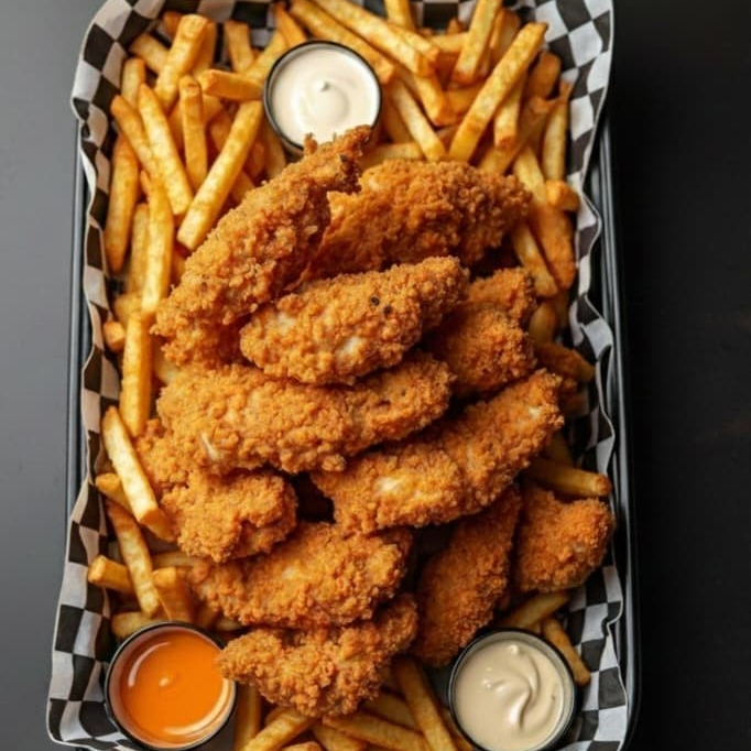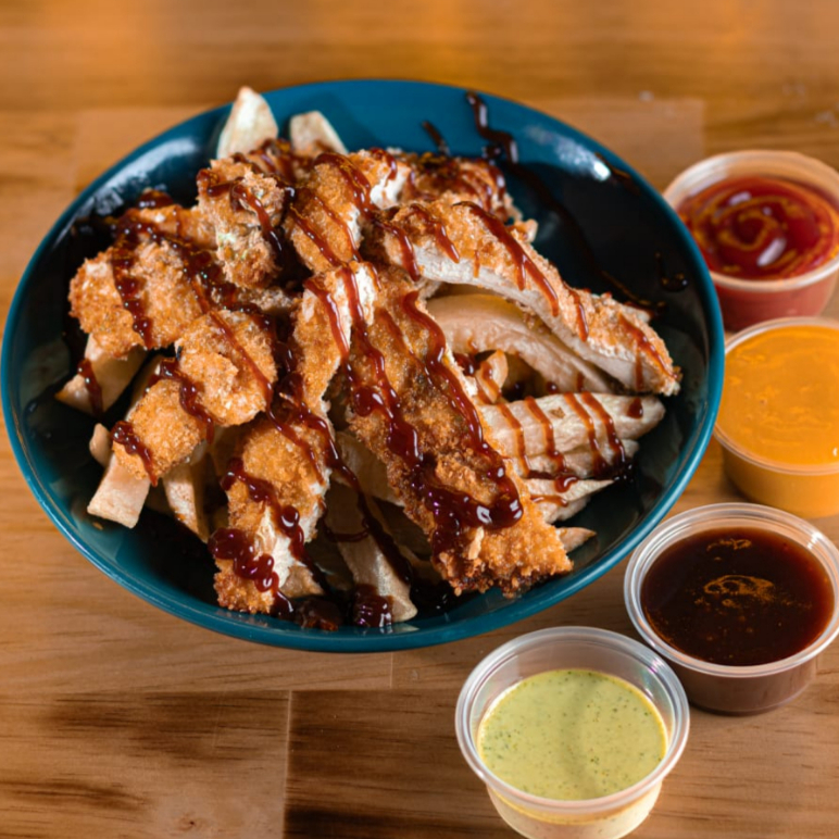 deliciosos trozos de pechuga de pollo, perfectamente dorados y crujientes, acompañados de papas a la francesa y salsa de la casa. (5 a 7 unidades según el tamaño)