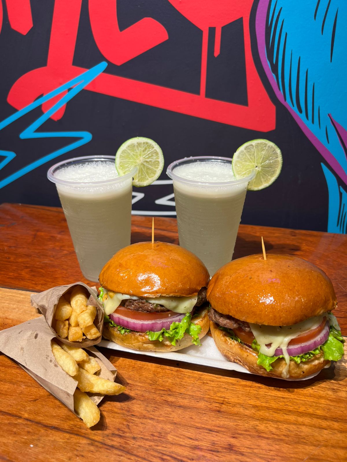 2 de nuestras Hamburguesas Sencillas (Pan artesanal, carne, queso mozzarella , lechuga, cebolla morada, tomate y salsa de la casa), 2 Porciones de Papas Francesas + 2 Limonada Naturales