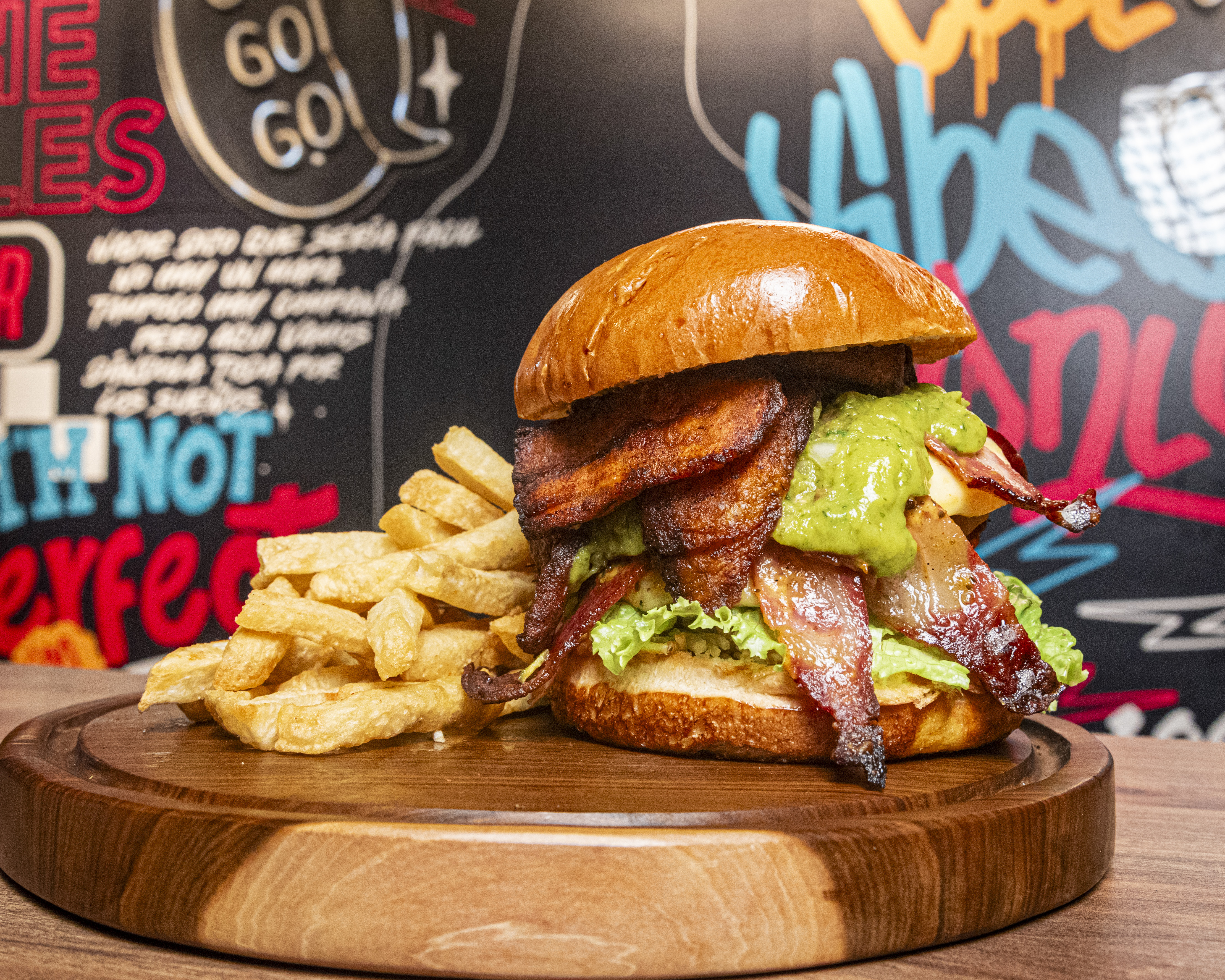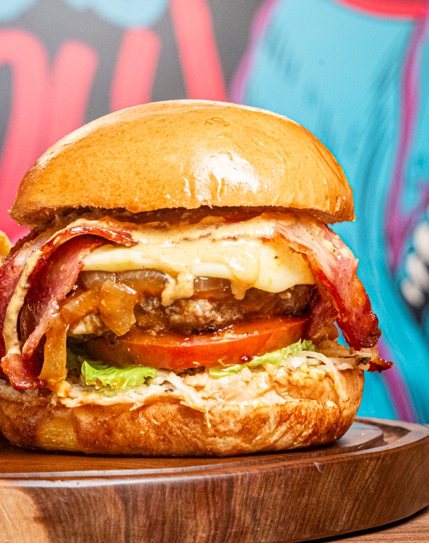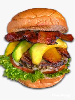 Pan artesanal, lechuga crespa, tomate, carne Angus, queso mozzarella fundido, maduro tajadas, aguacate tajadas tocineta