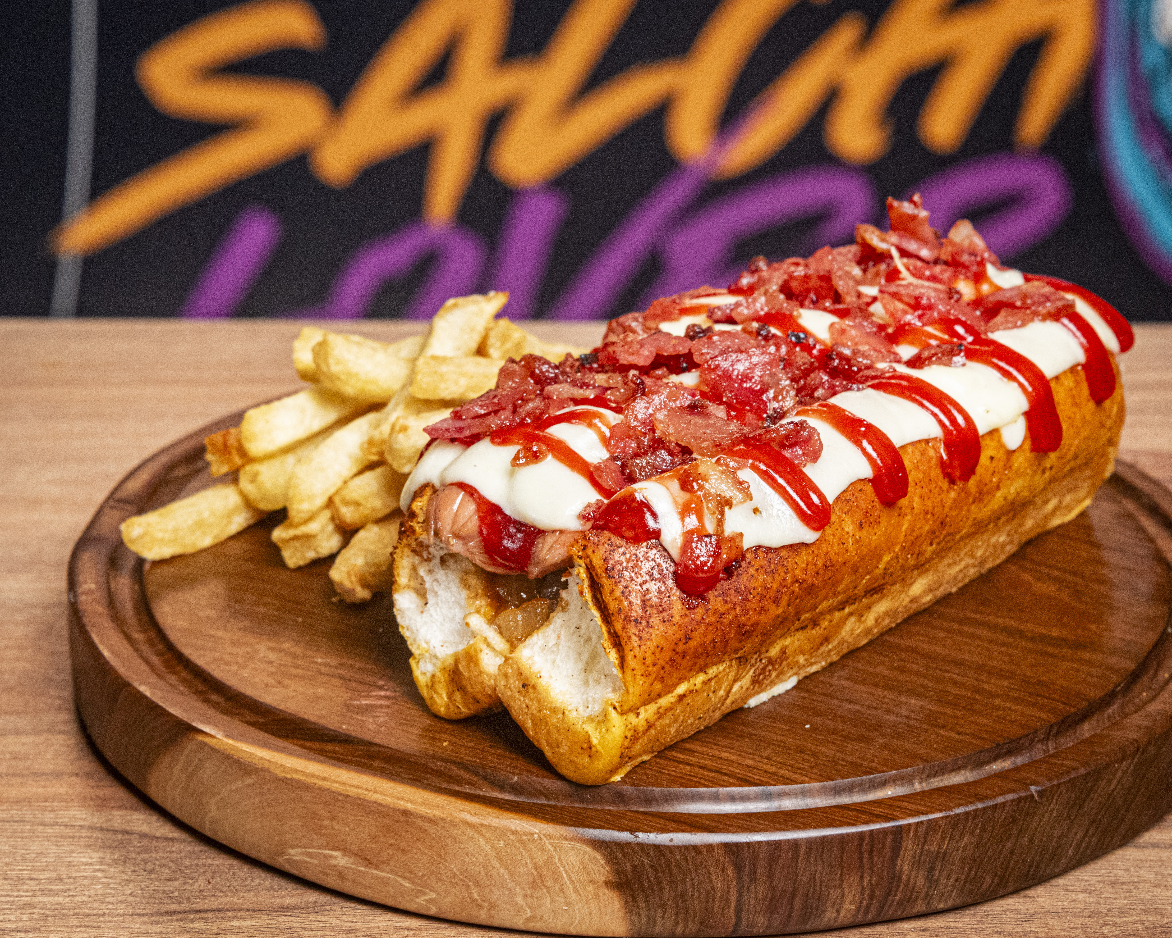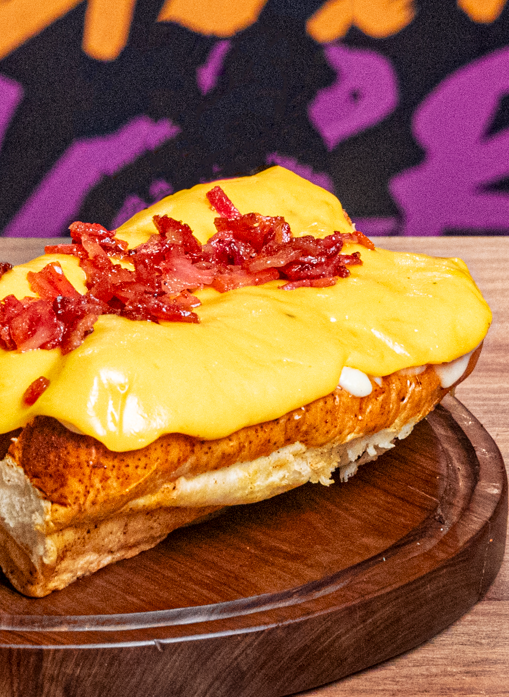 Pan artesanal, salchicha americana, queso cheddar líquido y tocineta crocante