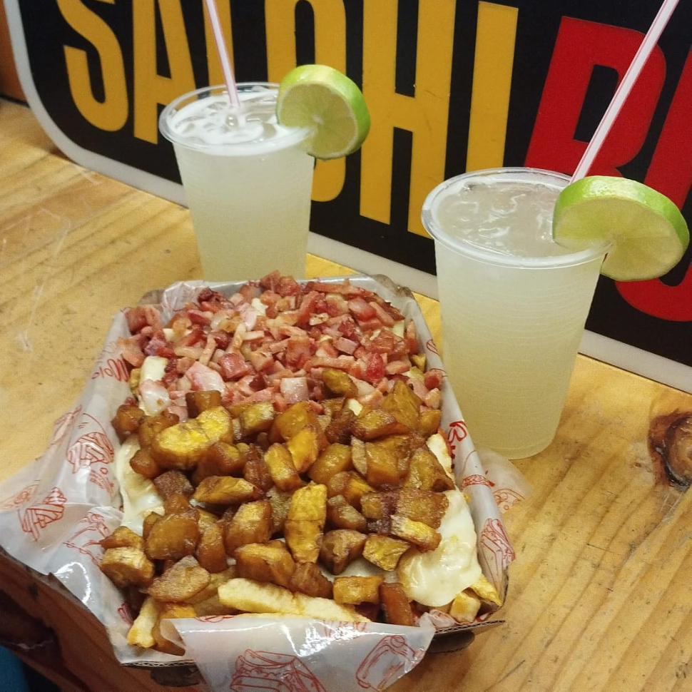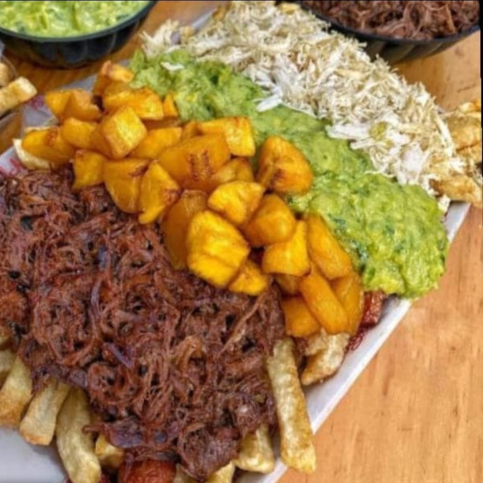 Papas a a la francesa, salchicha ranchera, queso gratinado, carne desmechada, pollo desmechado, maduro y guacamole.