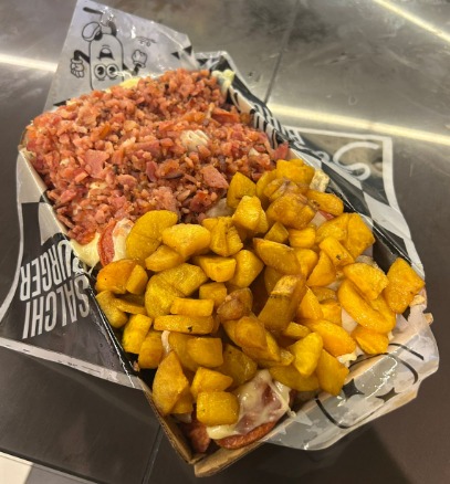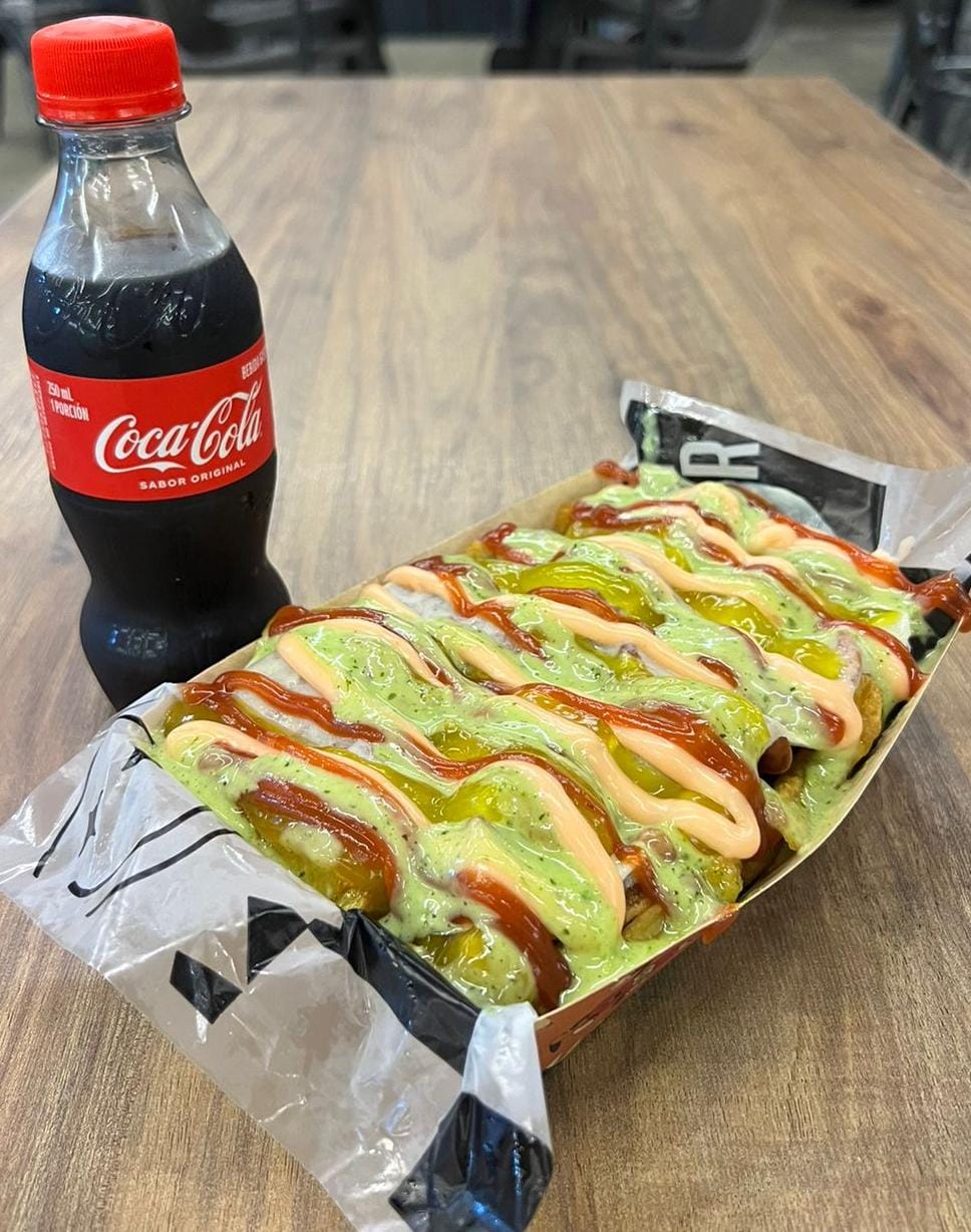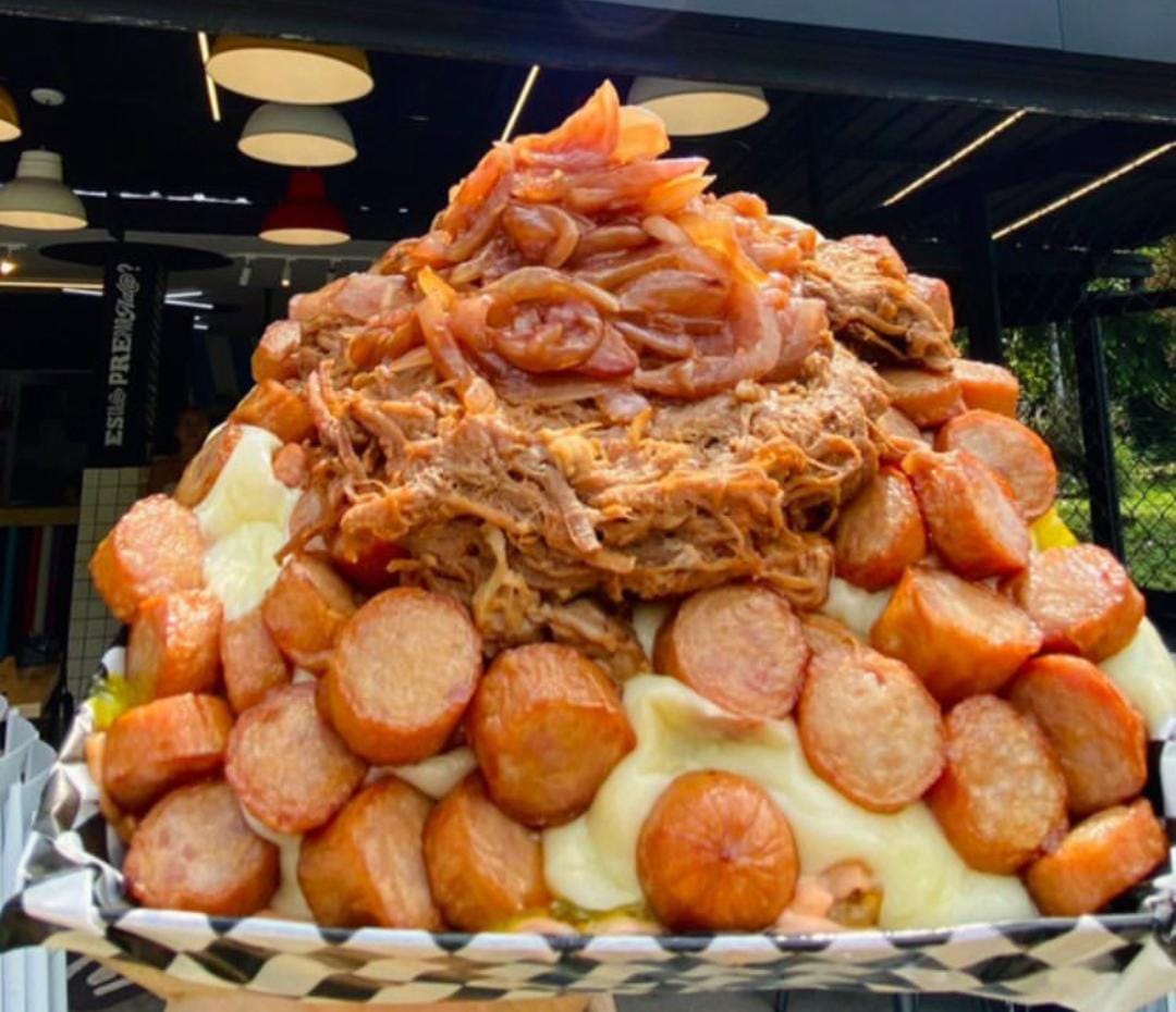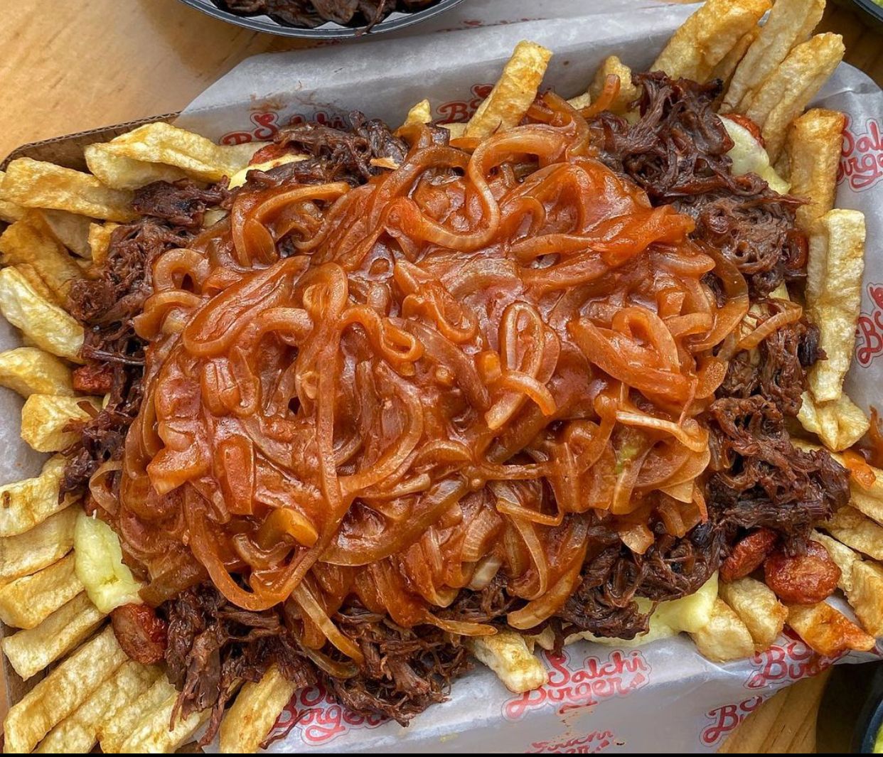 Papas a la francesa, salchicha ranchera, queso gratinado, carne desmechada, cebolla caramelizada y salsas.