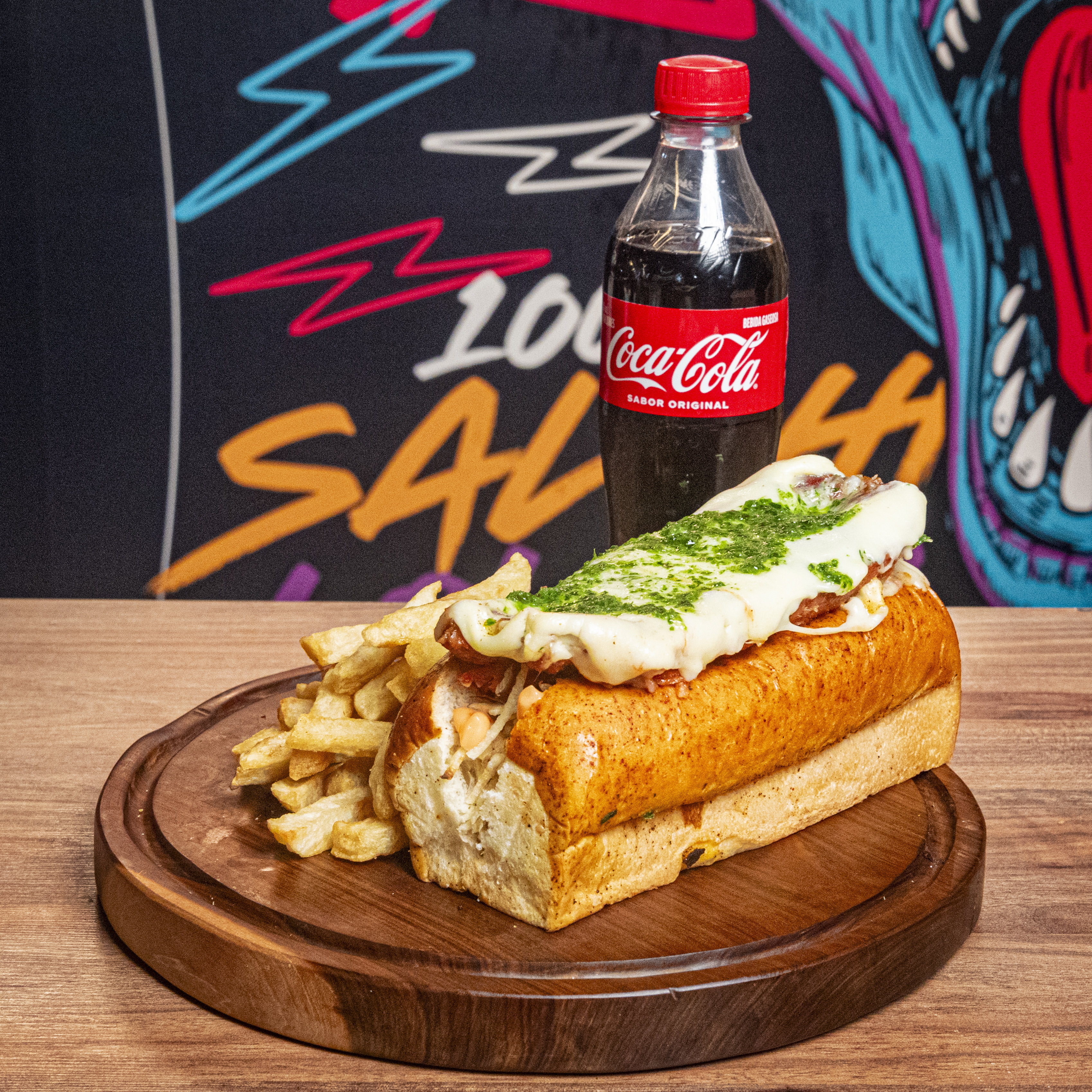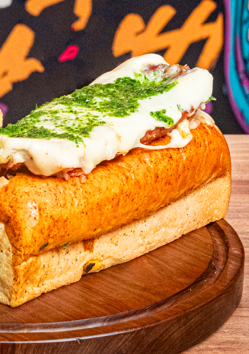 Pan artesanal, chorizo asado en chimichurri, queso fundido y salsa de la casa