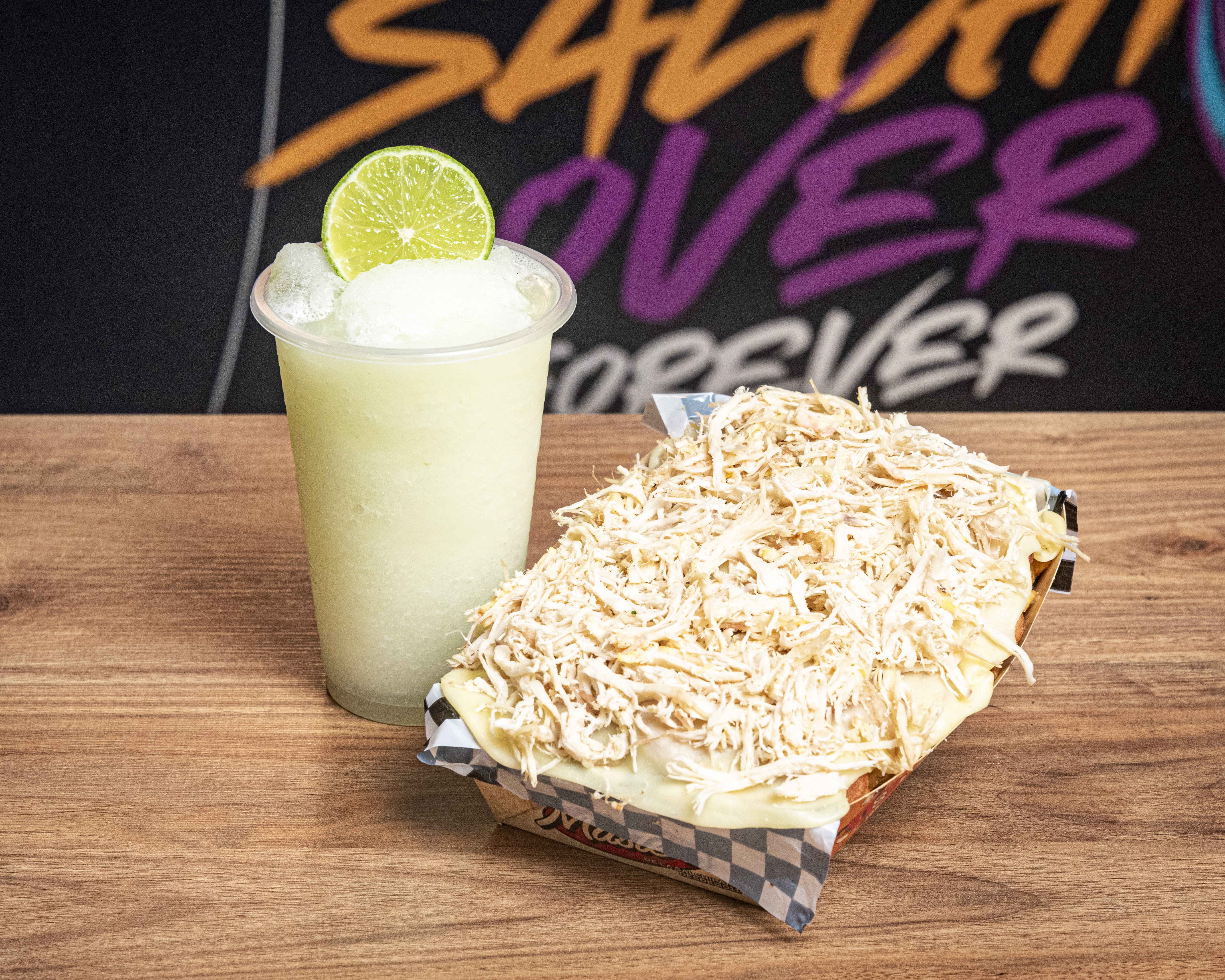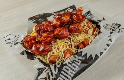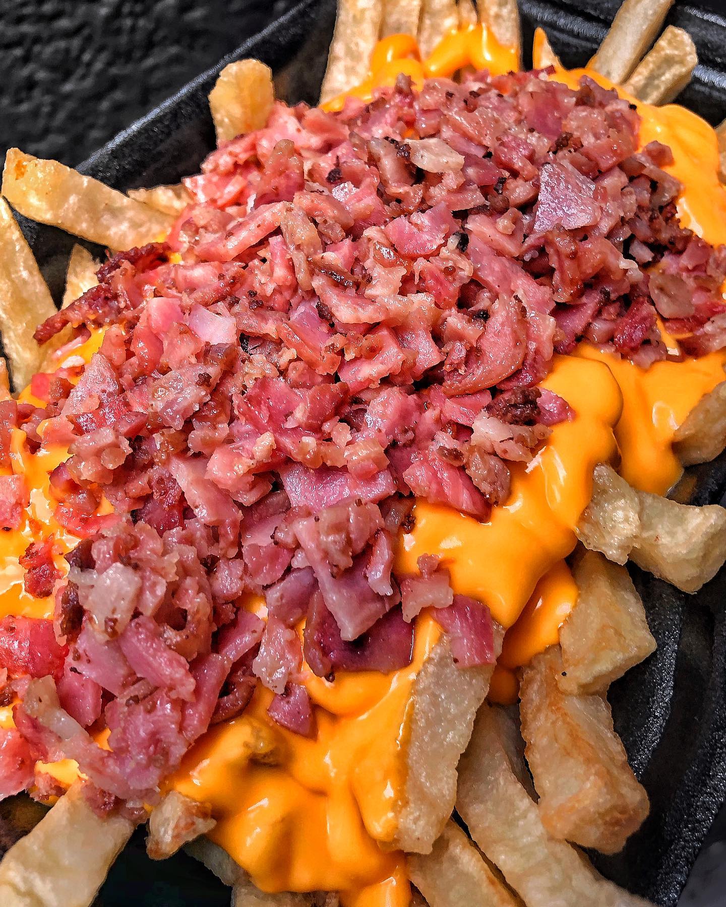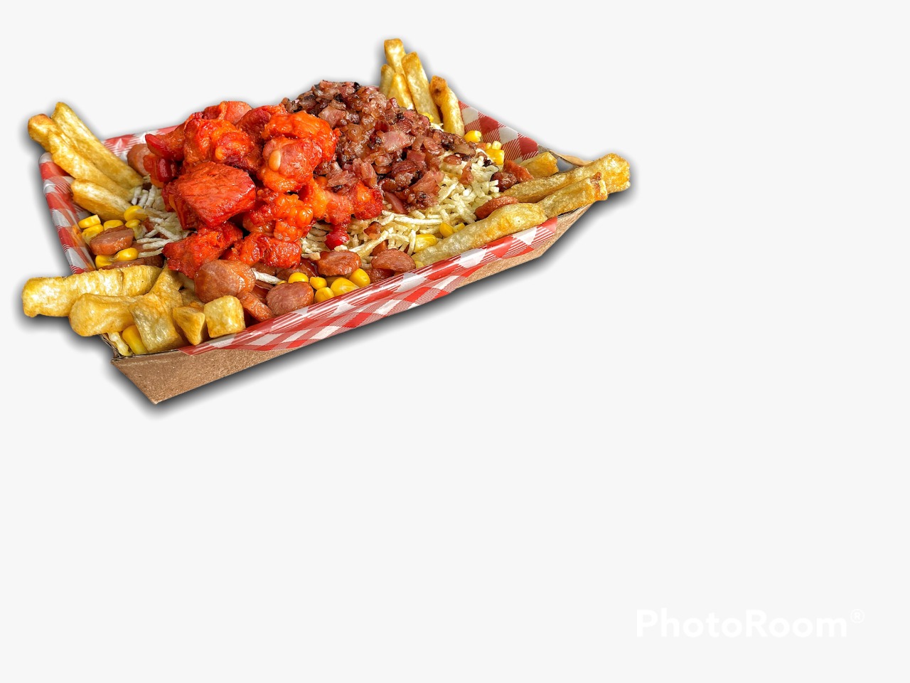 Papas a la francesa, salchicha ranchera, queso fundido con maicitos, ripio, costilla BBQ y tocineta crocante.