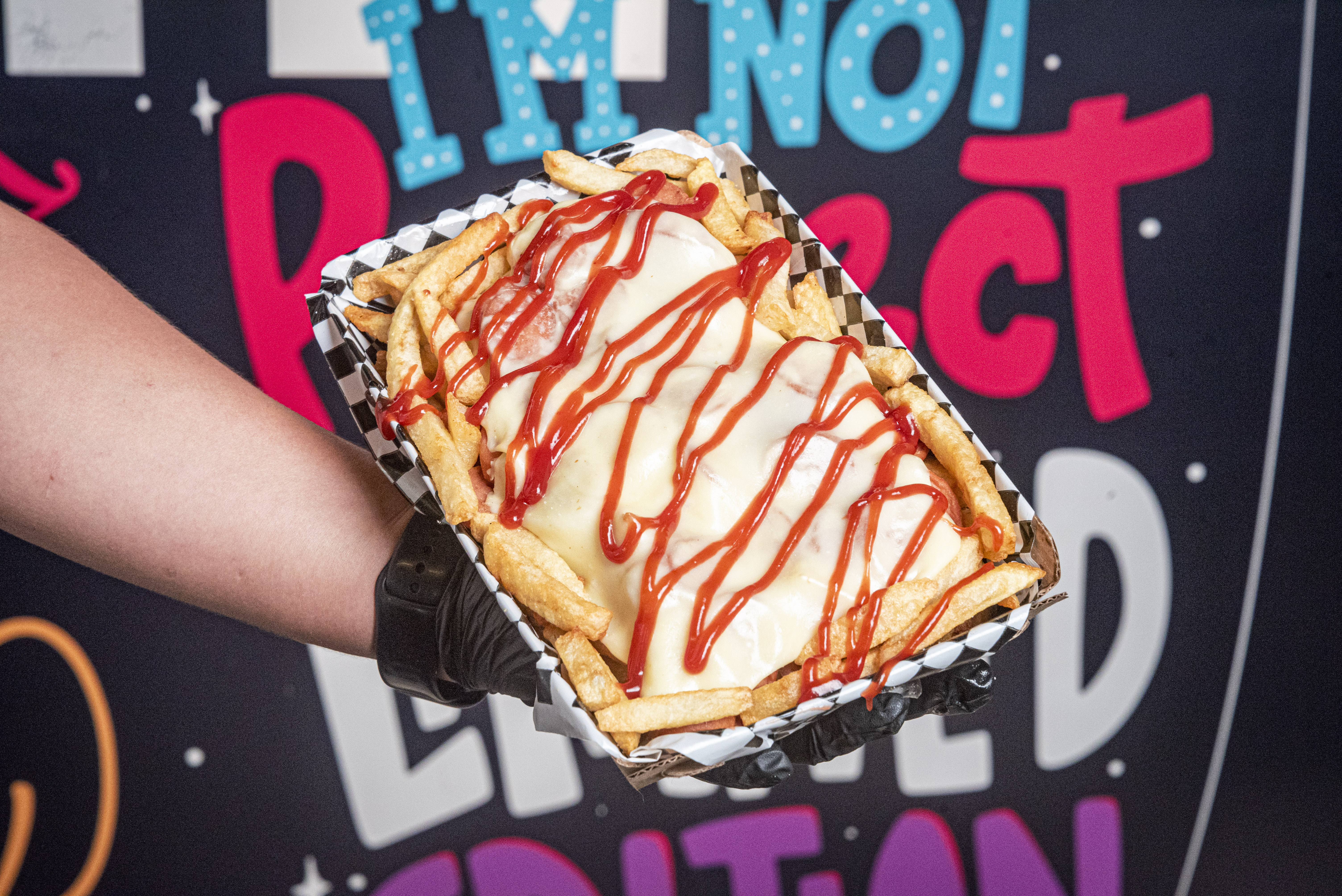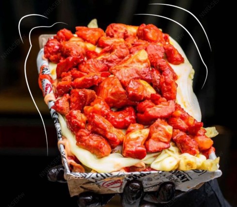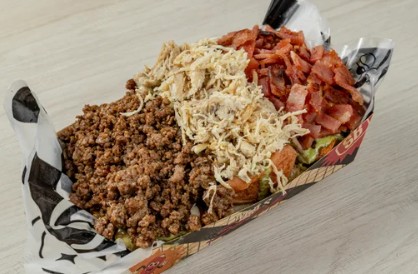 Papas a la francesa, salchicha, carne molida, pollo desmechado, tocineta crocante y queso gratinado en salsa de la casa.