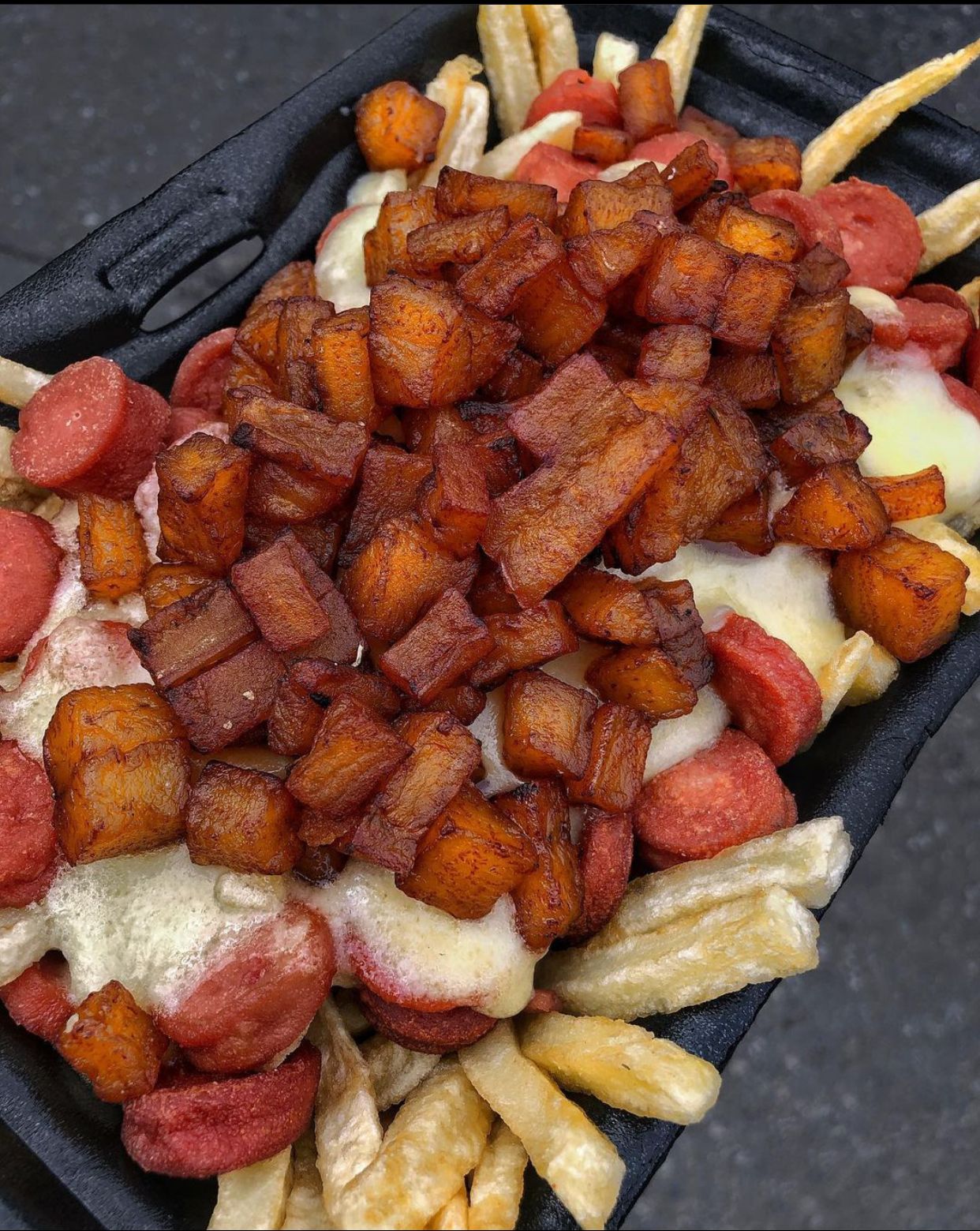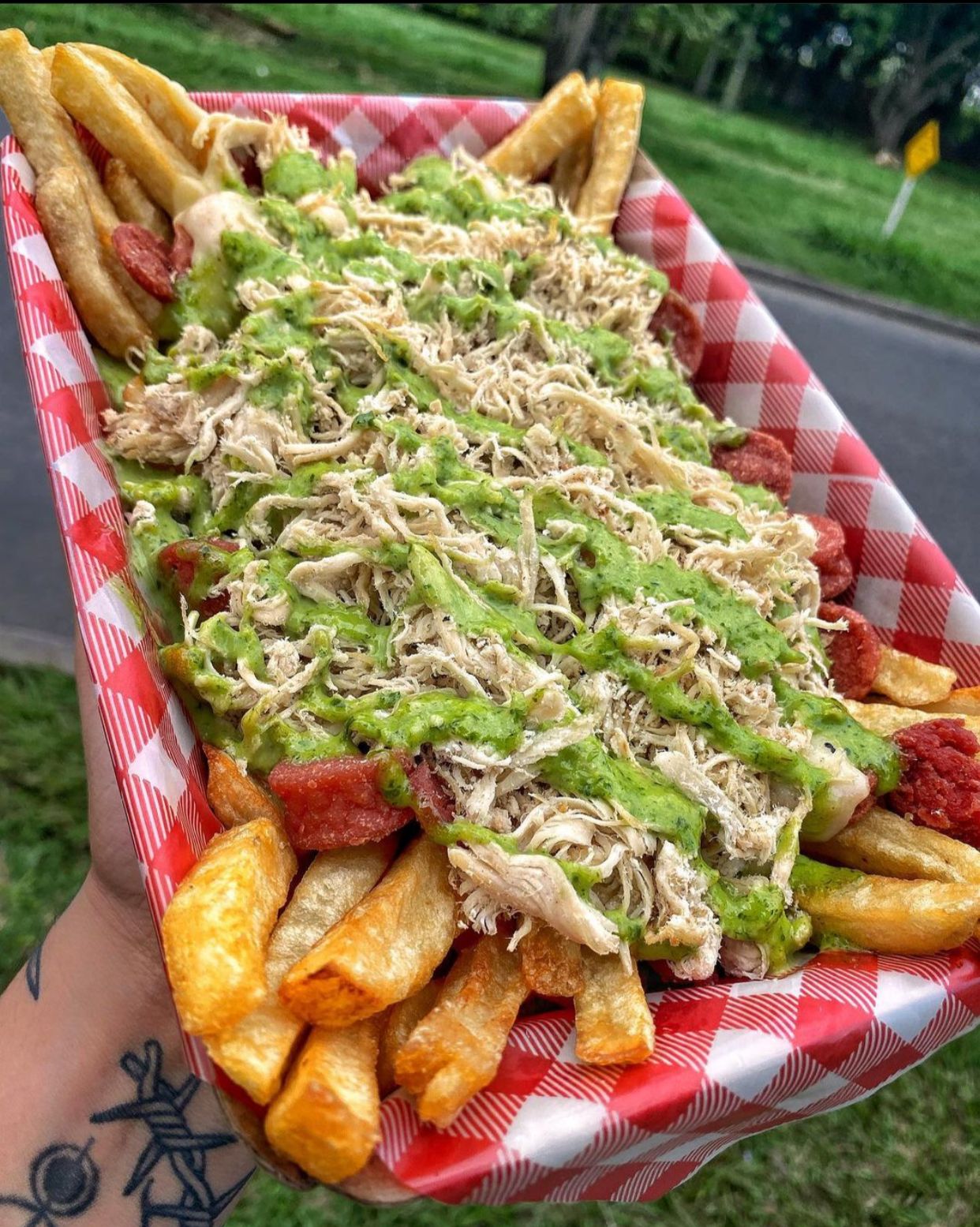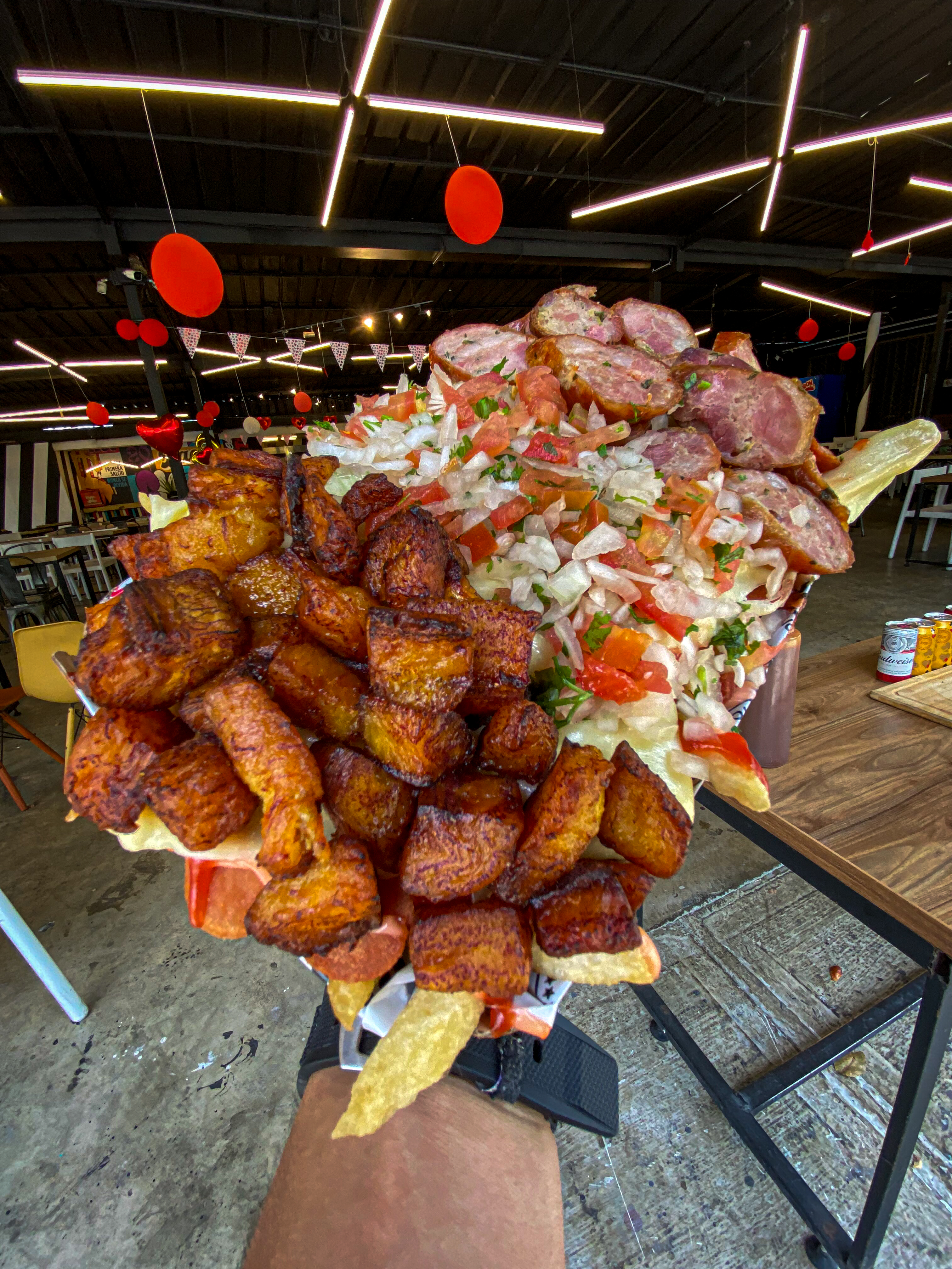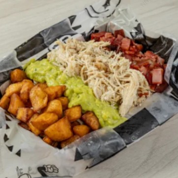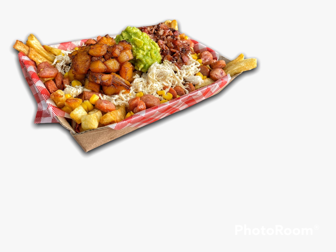 Papas a la francesa, salchicha ranchera, queso fundido con maicitos, maduro picado, pollo desmechado, tocineta crocante y guacamole.