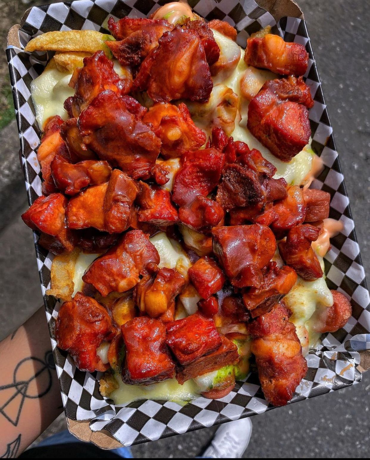 Papas a la francesa, salchicha, queso gratinado, costillas bañadas en BBQ y salsas!