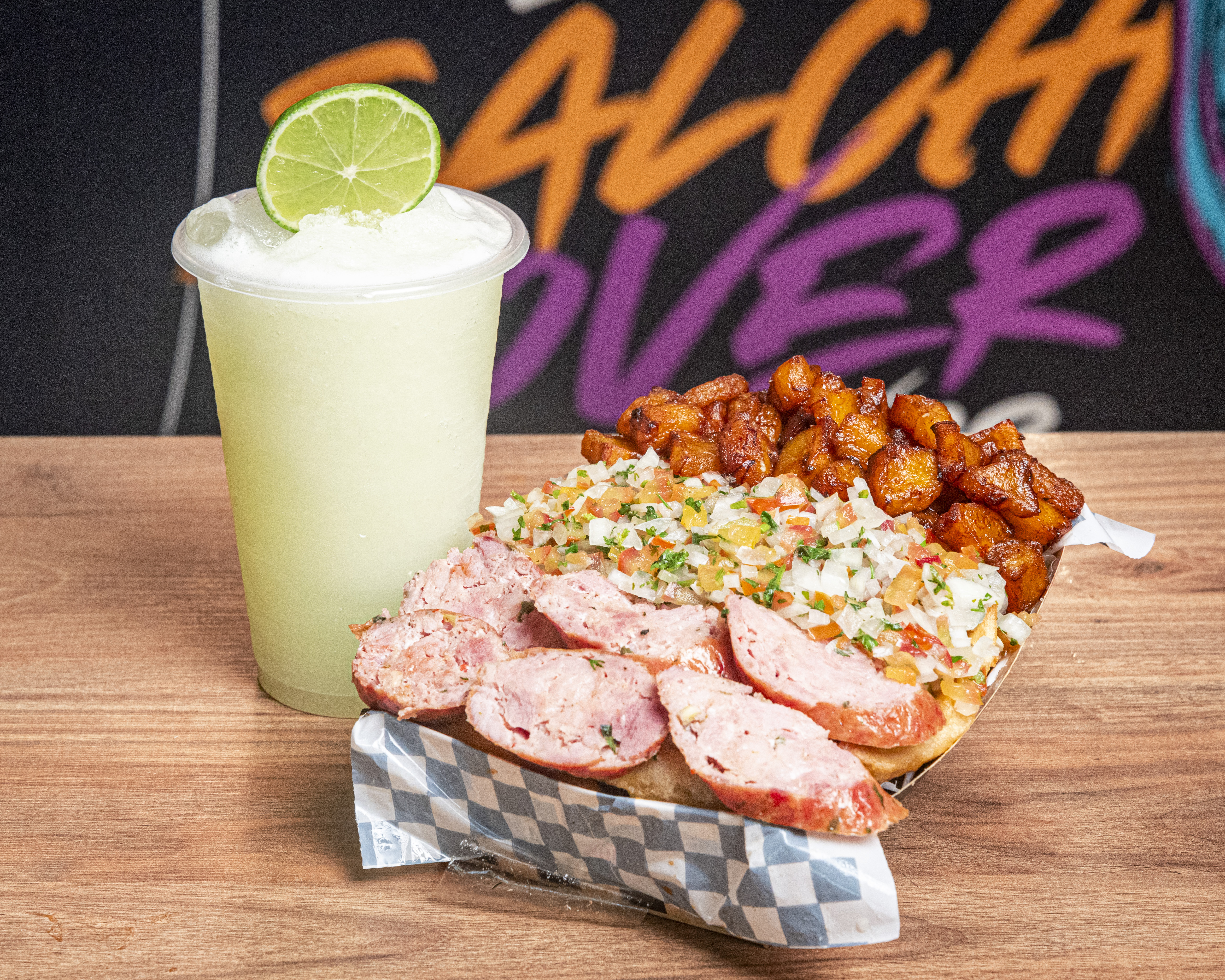 Papas a la francesa, salchicha, queso gratinado, maduro, pico de gallo y chorizo