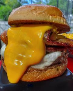Pan artesanal, lechuga crespa, tomate, carne Angus, queso mozzarella fundido, doble tocineta queso cheddar
