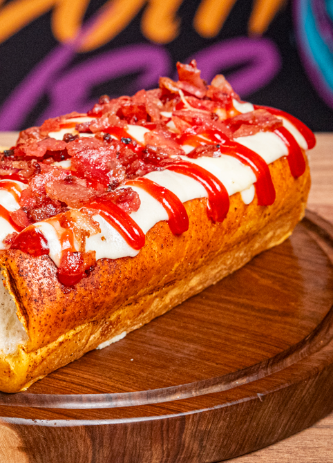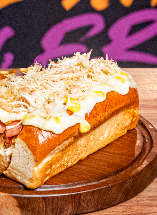 Pan artesanal, salchicha americana, queso fundido con maicitos y pollo desmechado