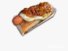 Pan artesanal, salchicha americana, queso fundido, tocineta crocante, ripio, cebolla caramelizada en BBQ y salsa de la casa