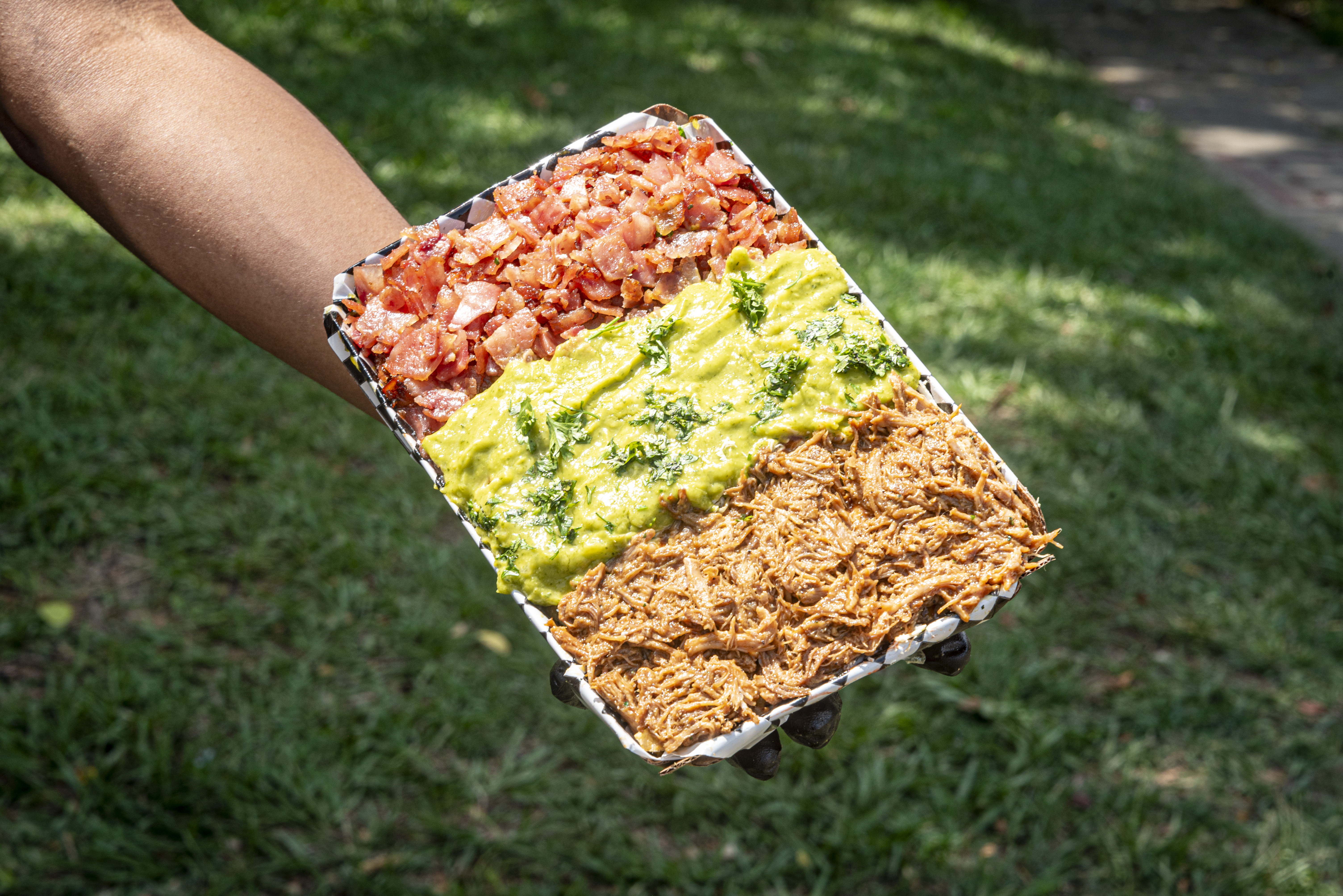 Papas a la francesa, salchicha, queso gratinado, guacamole, Tocineta y cerdo desmechado