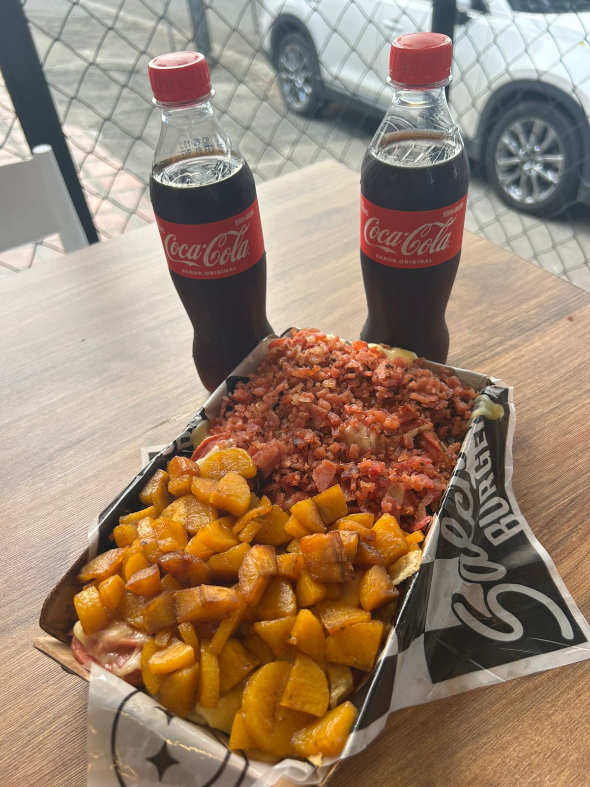 Papas a la francesa, salchicha, queso gratinado con maiz, tocineta y maduro + 2 Coca Cola 400ml