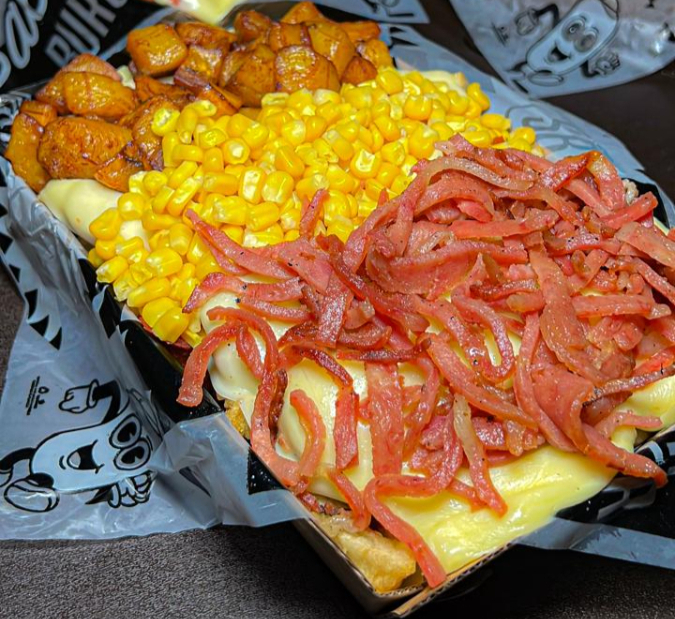 Papas a la francesa, salchicha ranchera, queso fundido con maicitos, ripio, costilla BBQ y tocineta crocante.