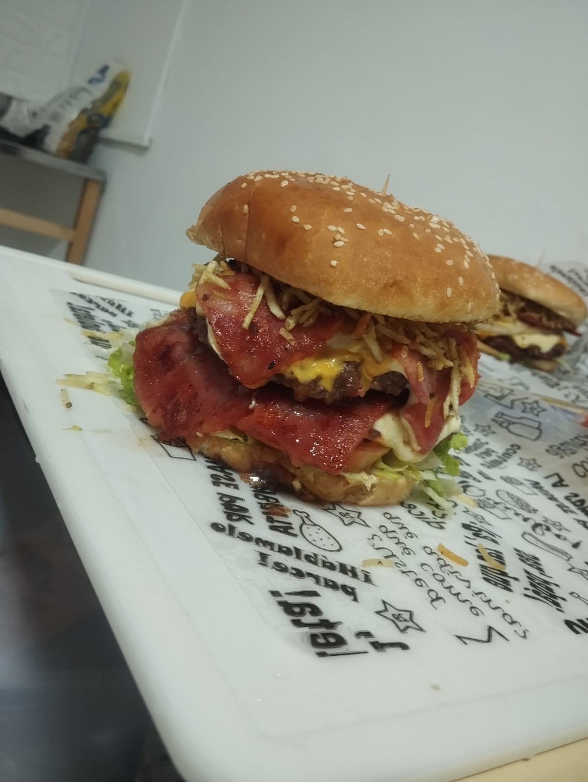 Doble carne 200 g, pan Bimbo, triple tocineta, doble queso moarella, queso cheddar, lechuga, tomate, ripido. salsas de la casa.