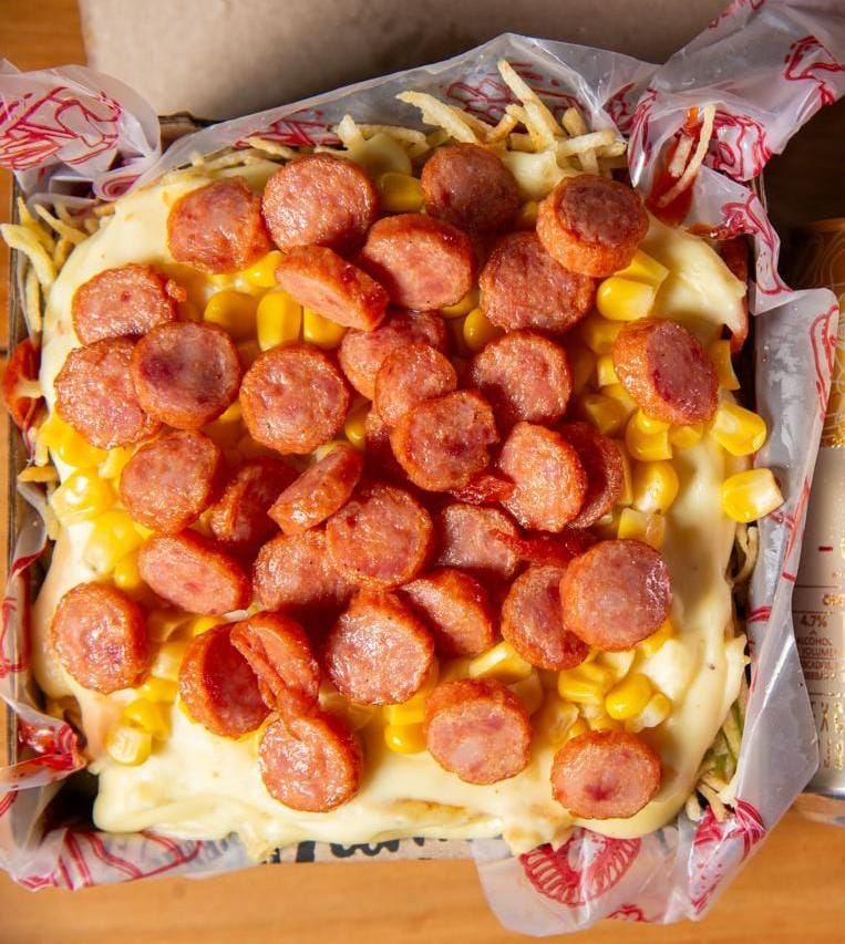 Salchipapa para 2 personas con papa criolla, salchicha premium, bondiola de cerdo, maíz, queso mozzarella, ripio de papa y salsa.