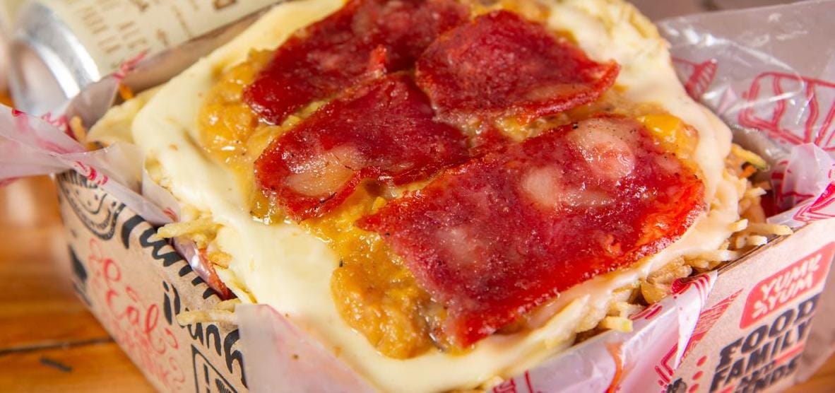Salchipapa para 2 con papa criolla, salchicha premium, tocineta, maduro, queso mozzarella, ripio de papa y salsa.