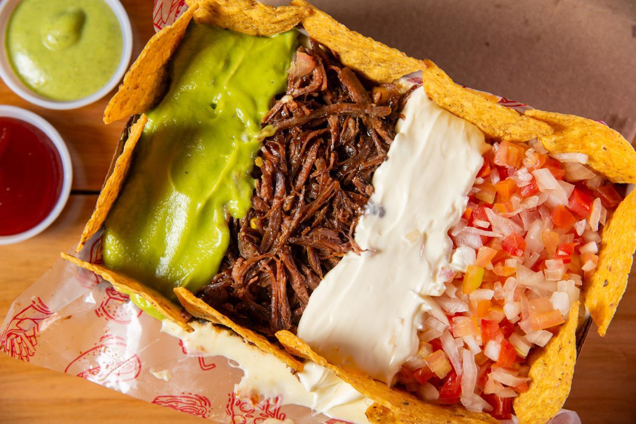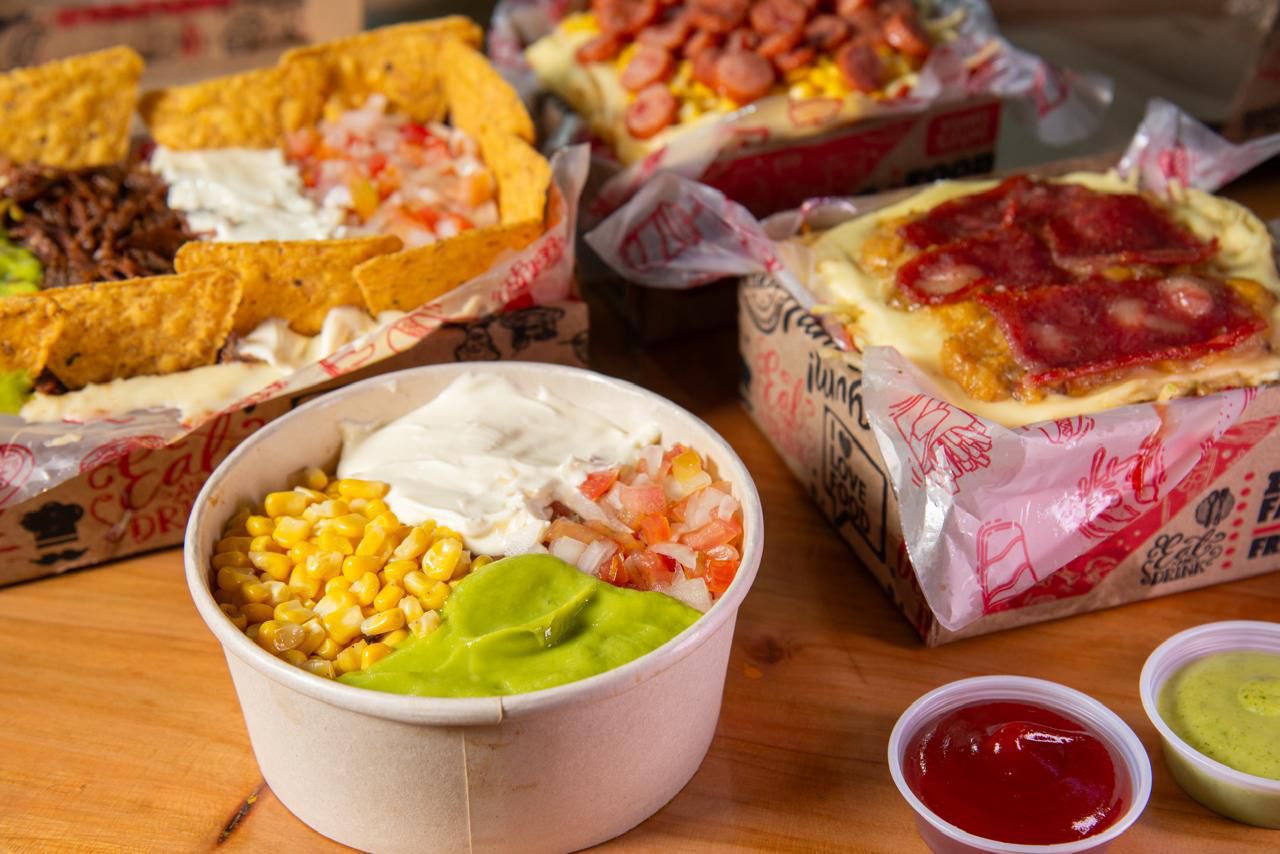 Salchipapa para 4 personas con papa criolla, salchicha premium, carne de res, guacamole, totopos de maíz, sour cream, queso mozzarella, ripio de papa y salsa.