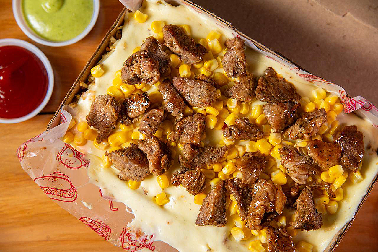 Papa criolla, salchicha premium, costilla BBQ, queso mozzarella, ripio de papa y salsa.