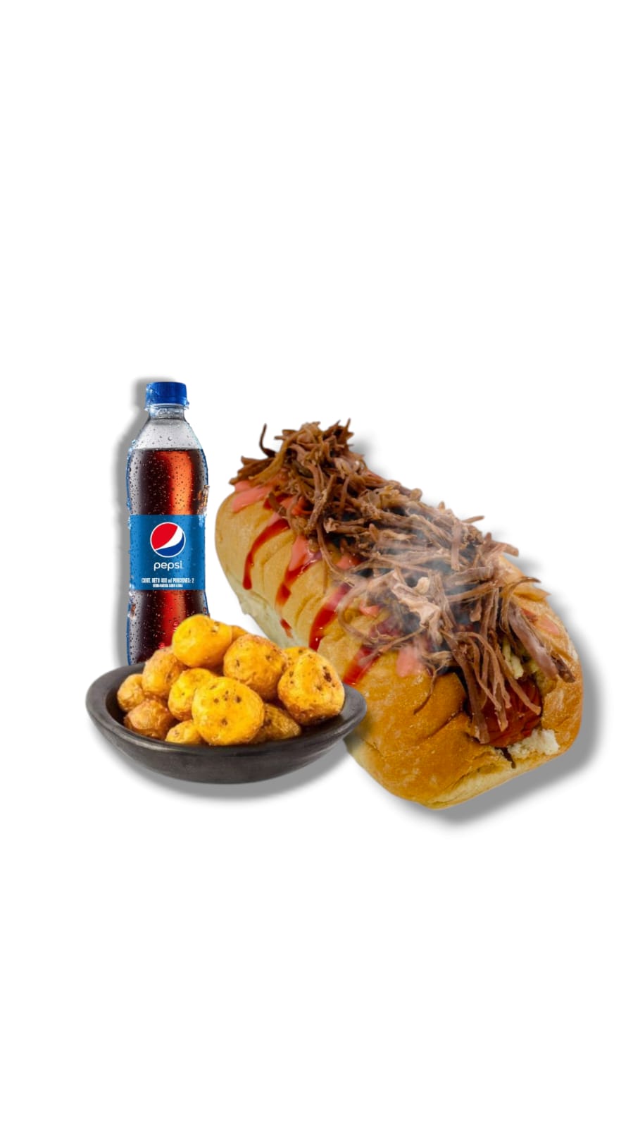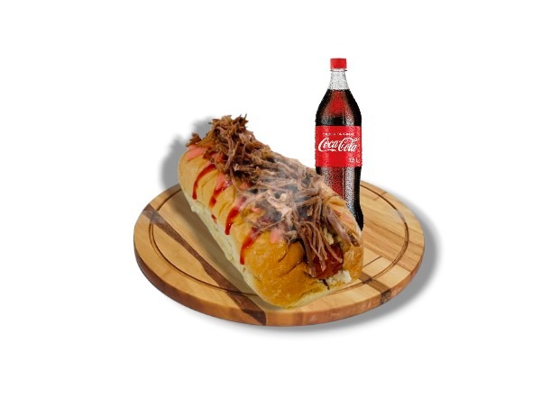 Pan artesanal, queso mozarella, carne desmechada en salsa sweed, tocineta ahumada, ripio de papa, salsas caseras y coca cola 250 ml.