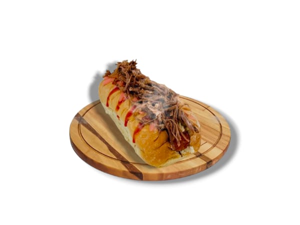 Pan artesanal, carne desmechada en salsa sweed, tocineta ahumada, ripio de papa y salsas.
