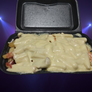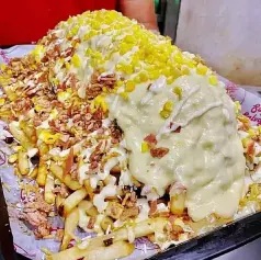 Combinación de papa francesa y criolla, salchicha tradicional, maduro guayabo, chorizo, tocineta, piña calada, queso mozzarella y salsas especiales de la casa,