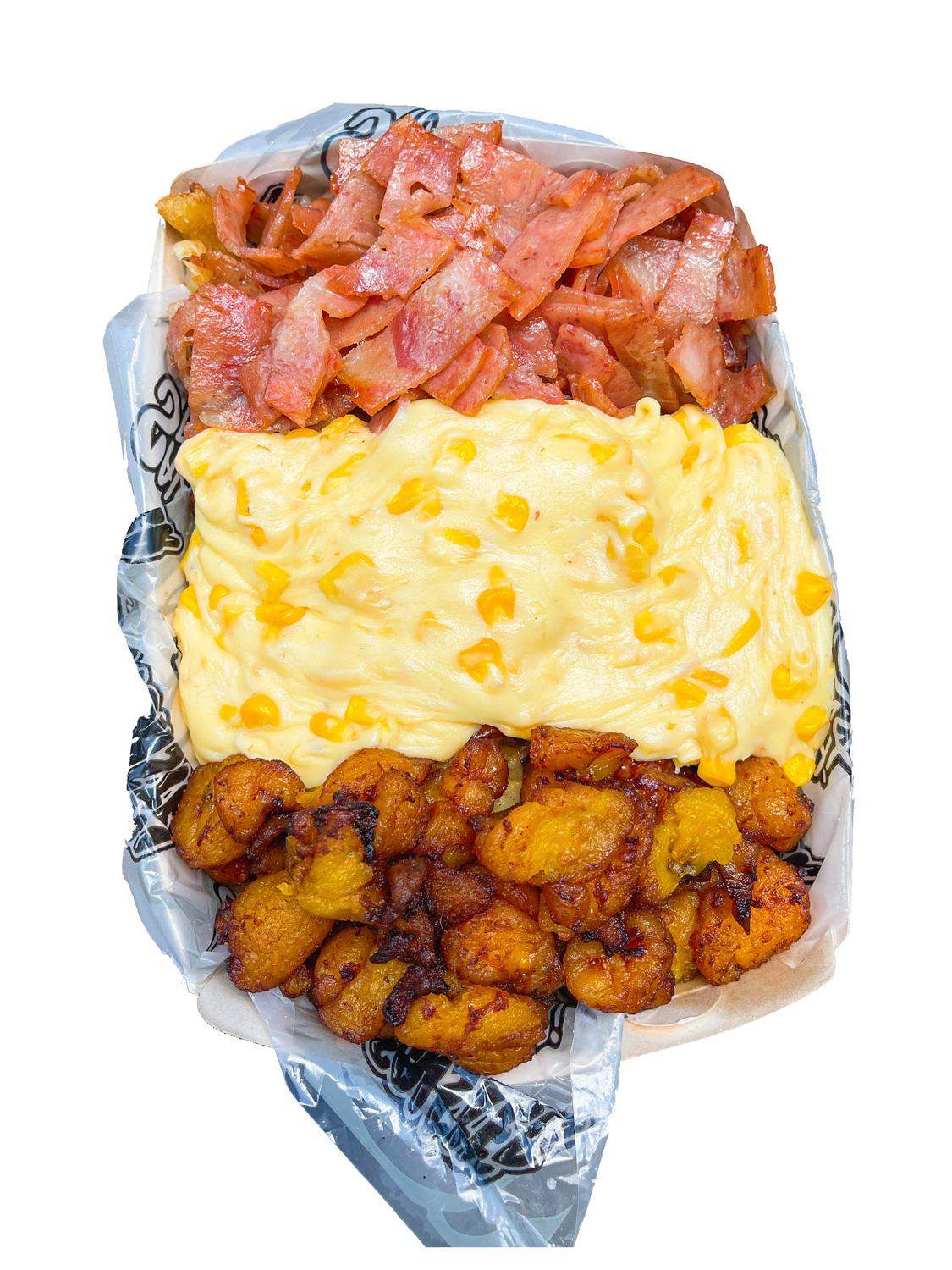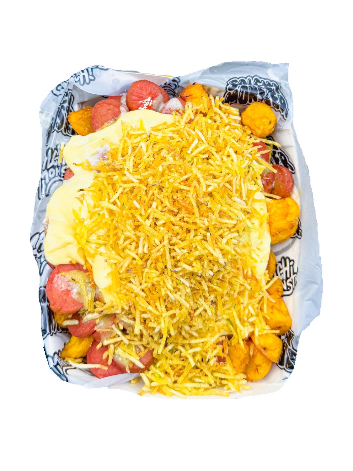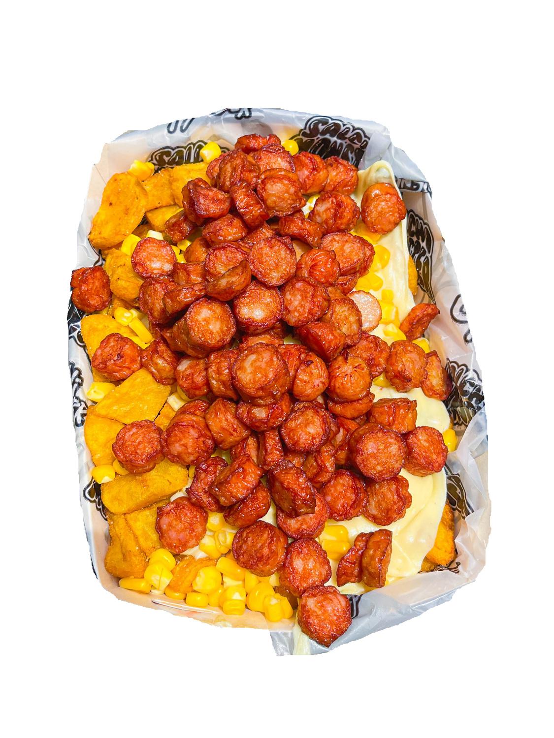 Salchipapa Personal 792 gr , Papa Amarilla, Salchicha Premium, Queso Gratinado, Maicitos,Maduro Guayabo,Bacon y Salsas Verde,Ajo,Bbq Honey