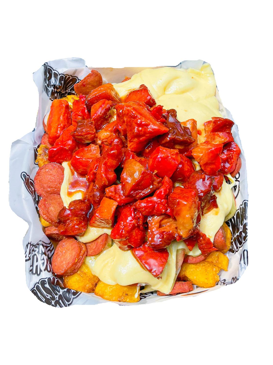 Salchipapa 1354 gr para 2 personas ,Papa Amarilla,Salchicha Premium,Queso Gratinado,Pollo Desmechado con Chimichurri,Maduro Guayabo , Maicitos y Salsa Verde,Ajo ,Bbq Honey