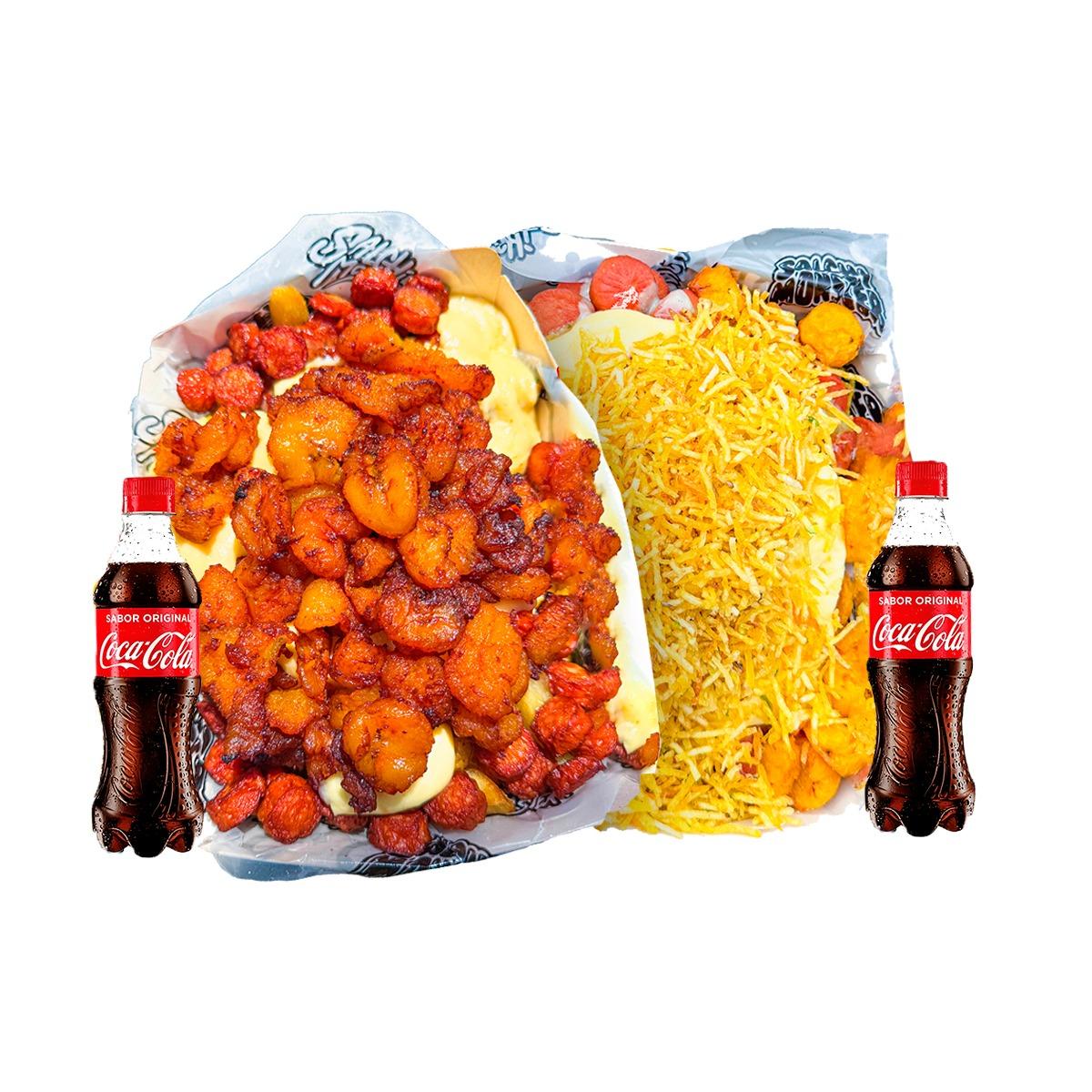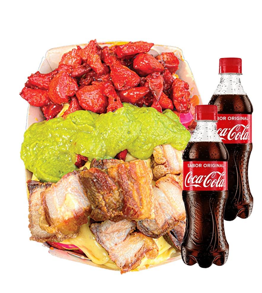 Salchipapa 1394 gr para 2 personas ,Papa Amarilla,Salchicha Premium,Queso Gratinado, Chorizo con limon Pimienta, Guacamole, Chicharron Carnudo con limon Pimienta , Salsas Verde,Ajo,Bbq Honey + 2 BEBIDAS 250 ML GRATIS