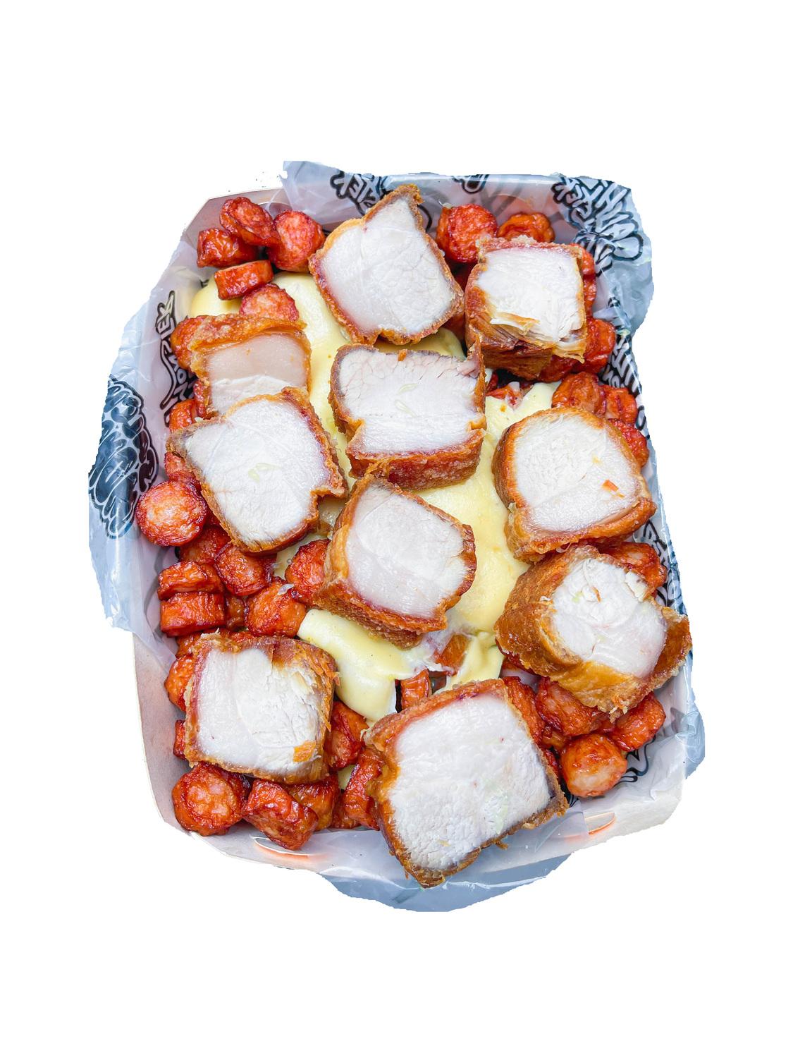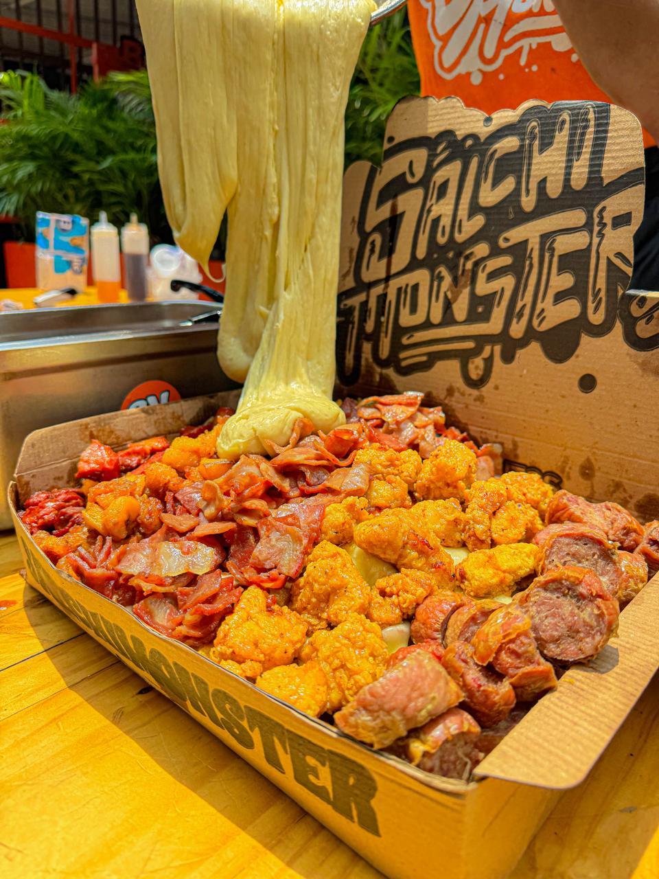 Salchipapa Personal 682 gr , Papa amarilla,Salchicha Premium ,Queso Gratinado,Trozos de Chicharron Carnudo con Limon Pimienta, y Salsas Verde,Ajo,Bbq Honey