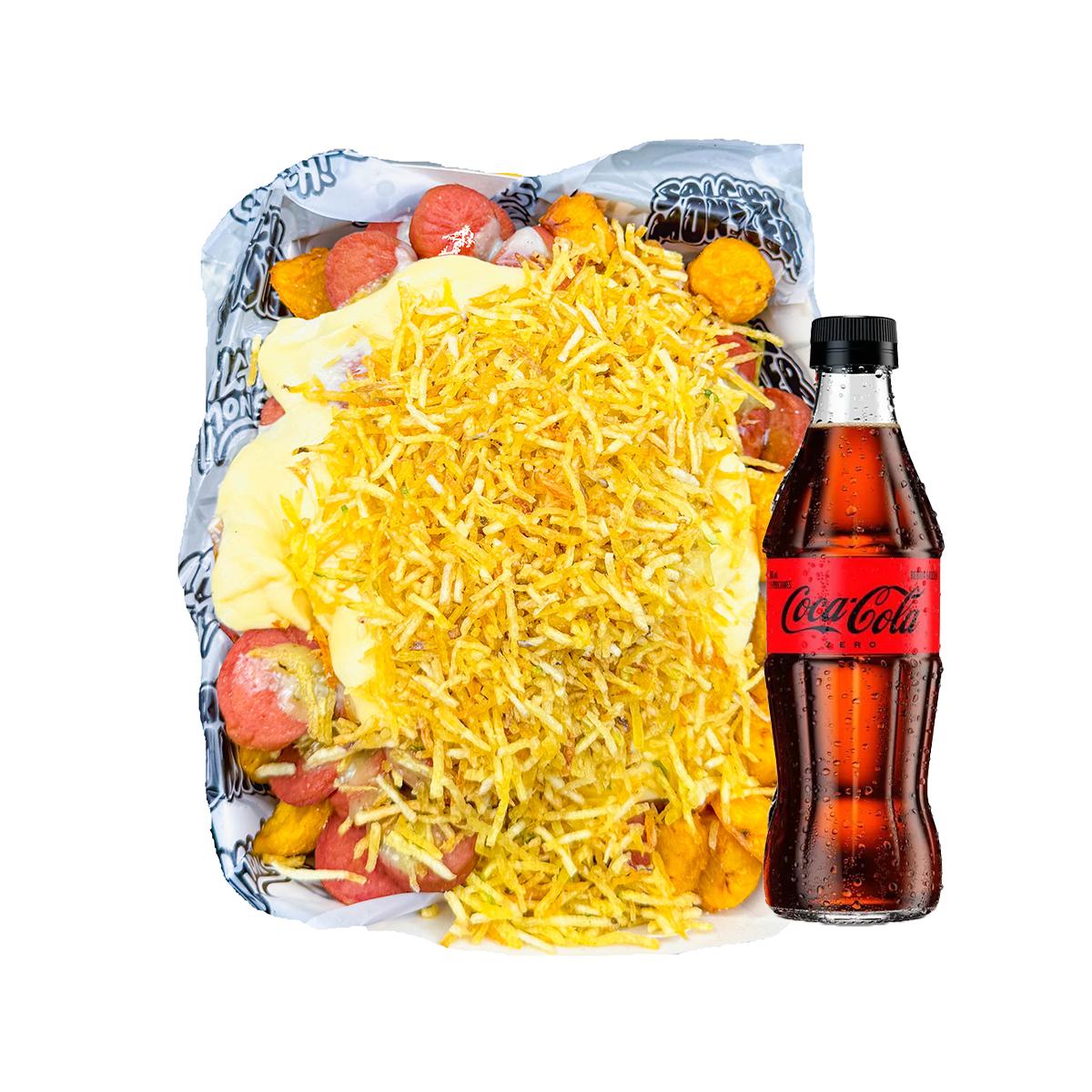 Salchipapa Personal 652 gr , Papa Amarilla, Salchicha Premium, Queso Gratinado,Maduro Guayabo, y Salsas Verde,Ajo,Bbq Honey + BEBIDA 250 ML GRATIS
