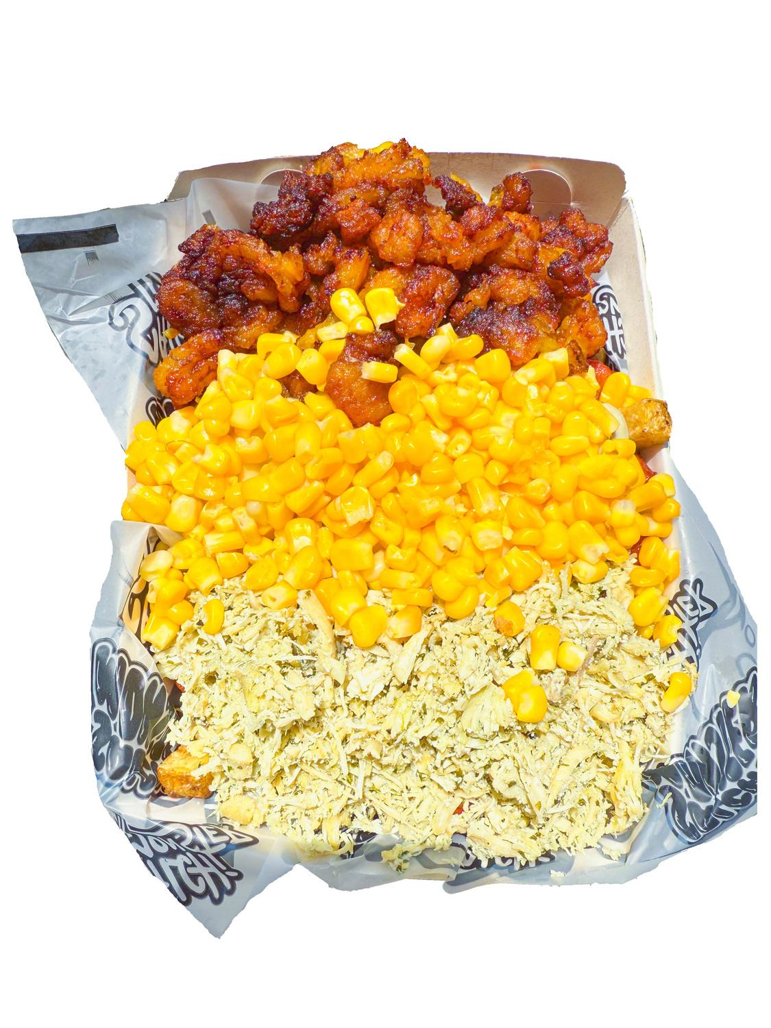 Patacón Con Queso Derretido, Pollo Desmechado con Chimichurri, Trozos de Chorizo y Maíz dulce.