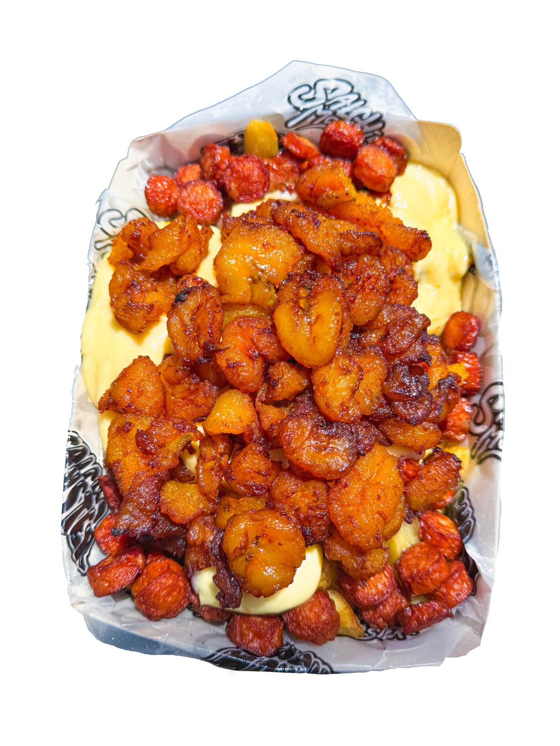 Maduro Con Queso Derretido, Trozos De Chicharrón Carnudo Con Limón Pimienta.