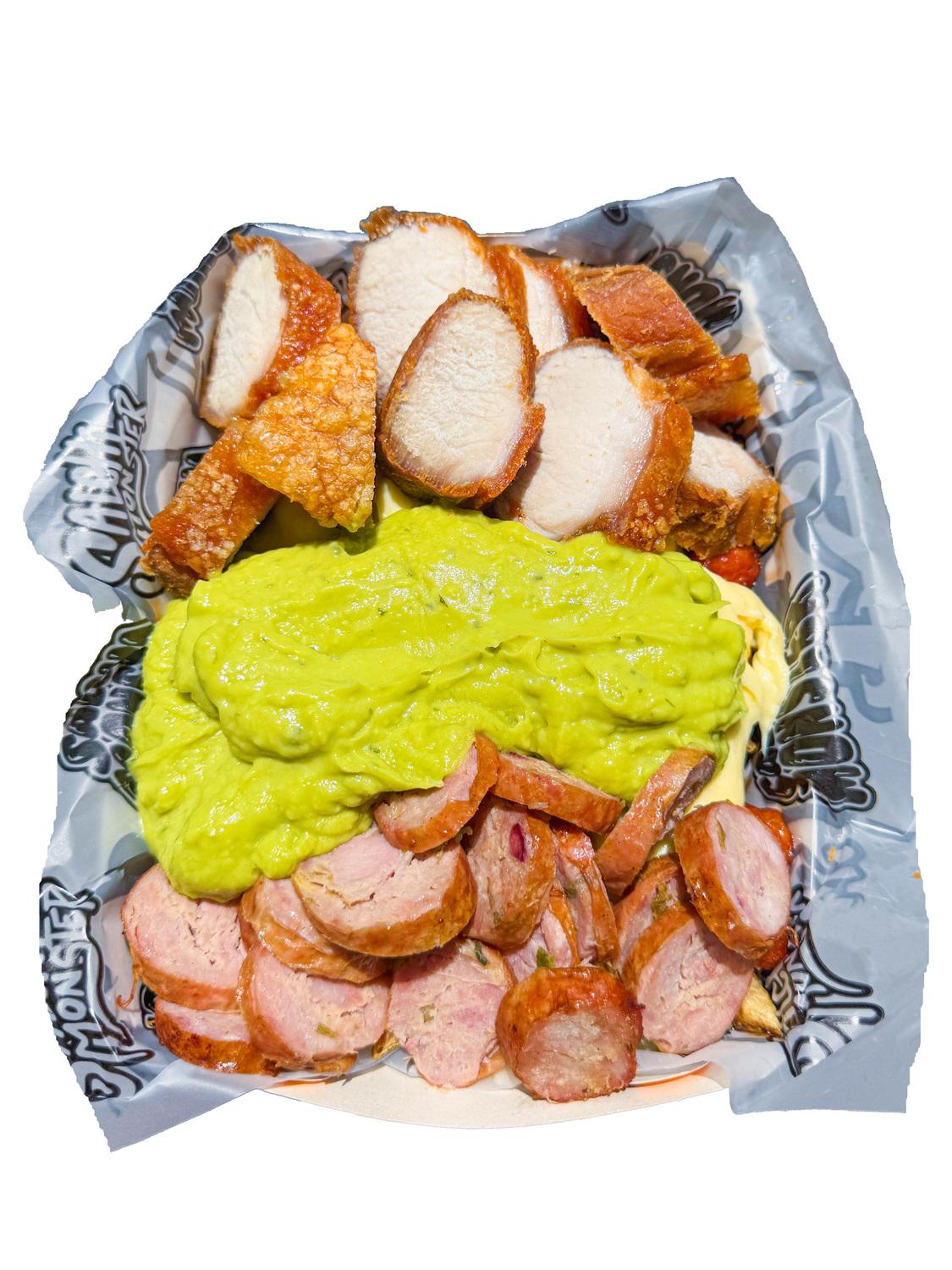 Salchipapa Personal 862 gr , Papa amarilla,Salchicha Premium,Queso Gratinado,Guacamole,Trozos de Chicharron Carnudo con Limon Pimienta,Costilla Ahumada SIN HUESO en Salsas Bbq Honey y Salsa Verde,Ajo,Bbq Honey