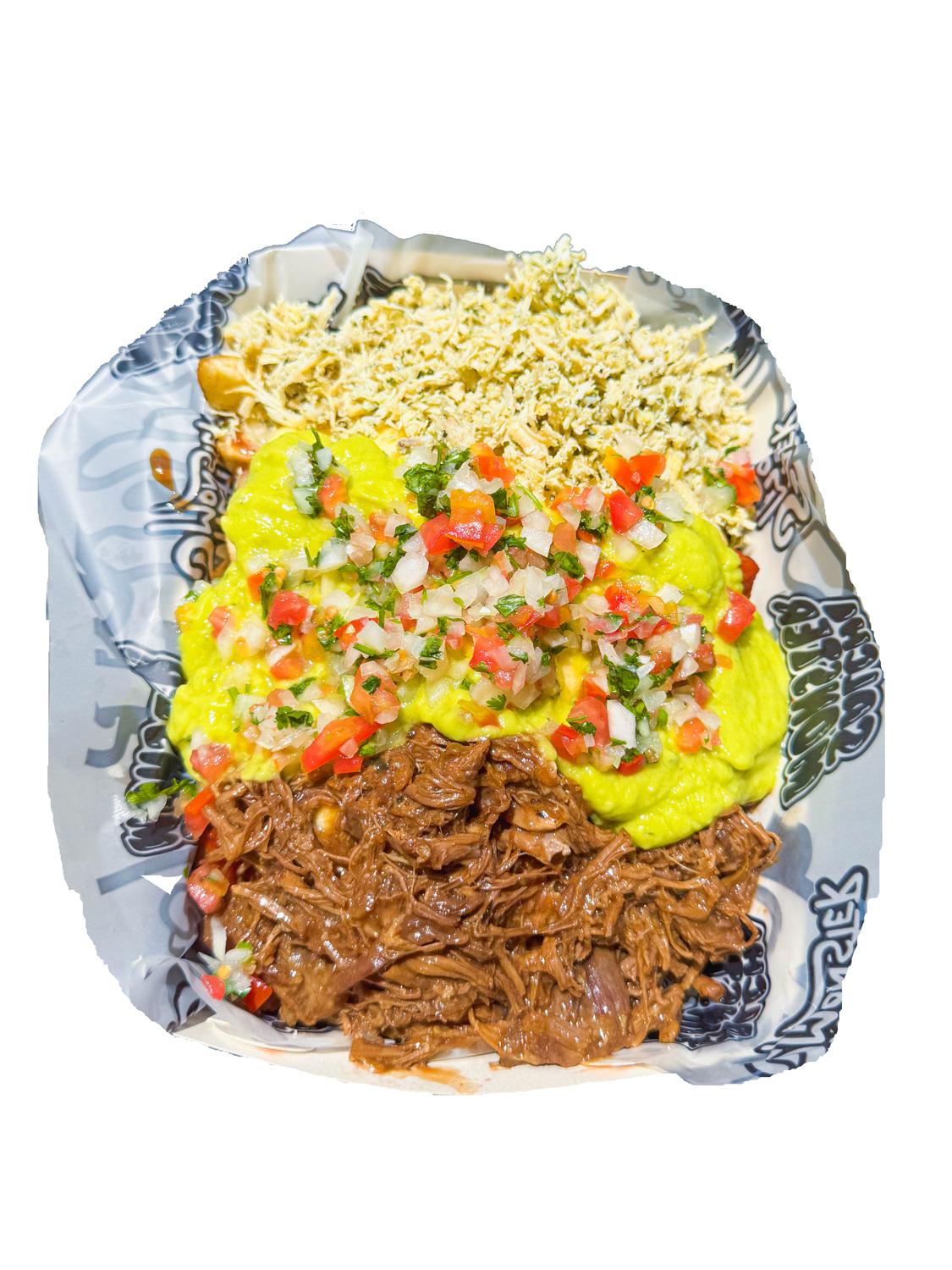 Salchipapa 1264 gr para 2 personas ,Papa Amarilla,Salchicha Premium,Queso Gratinado, Carne Desmechada en Salsa Bbq Honey,Pollo Desmechado con Chimichurri,Guacamole,Pico de Gallo. y Salsas Verde,Ajo,Bbq Honey