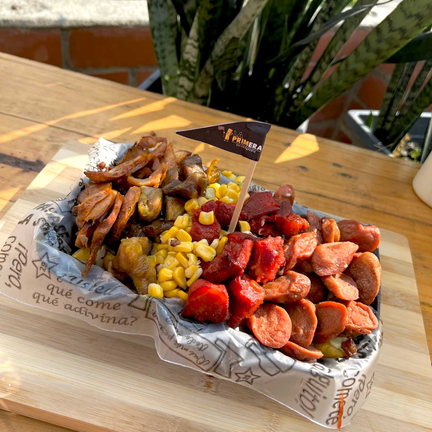Papa amarilla, papá francesa, salchicha, costilla, carne de cerdo, tocineta, chorizo, amigos, queso mozzarella, salsas