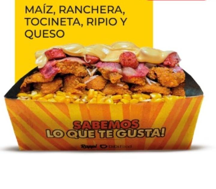 Maiz, Ranchera, Tocineta, Ripio, Queso y Pollo.