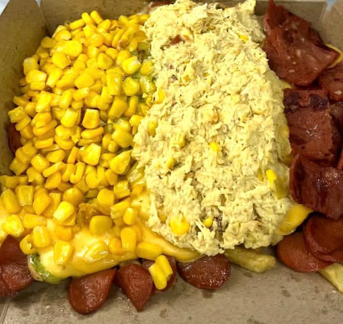 Pollo en crema, tocineta, maíz, queso, papa y salchicha.