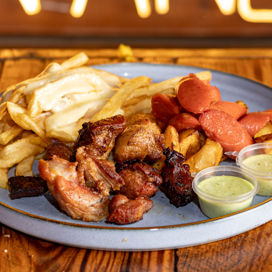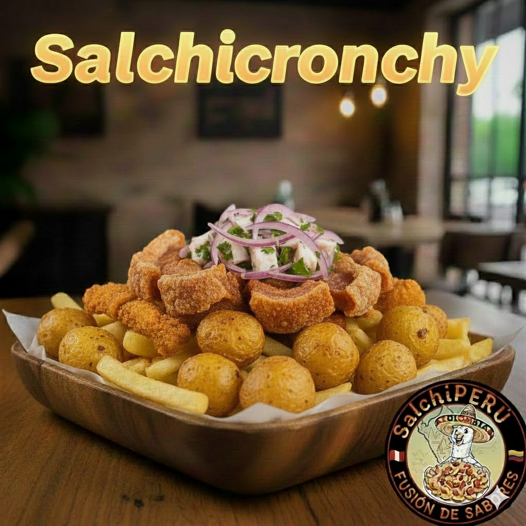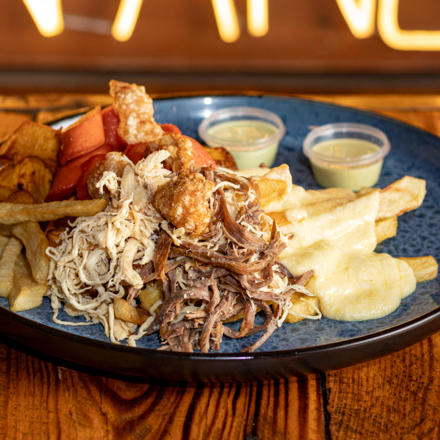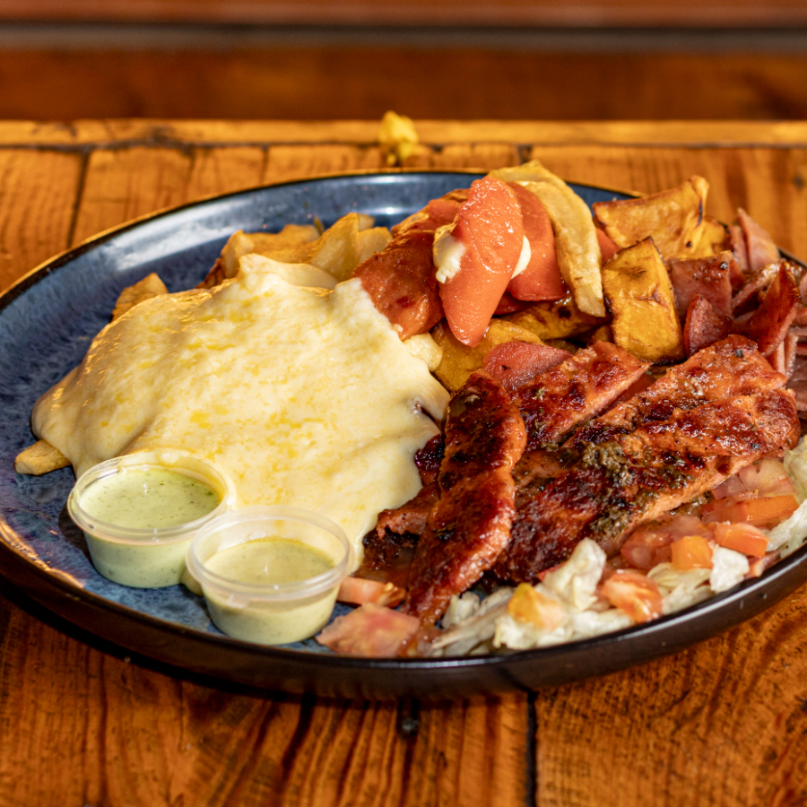 Papa amarilla y francesa crocante, salchicha, costilla ahumada en trozos, queso gratinado acompañado de salsa y ají de la casa.