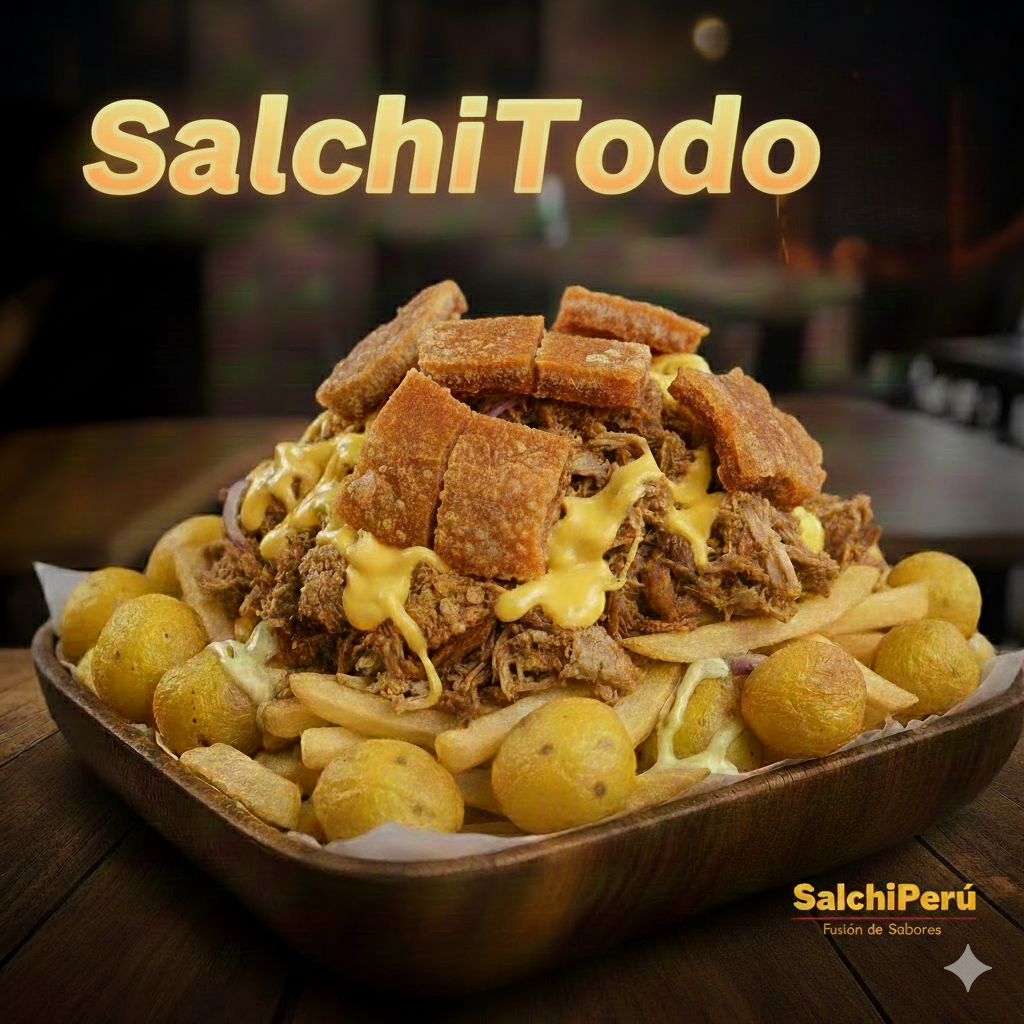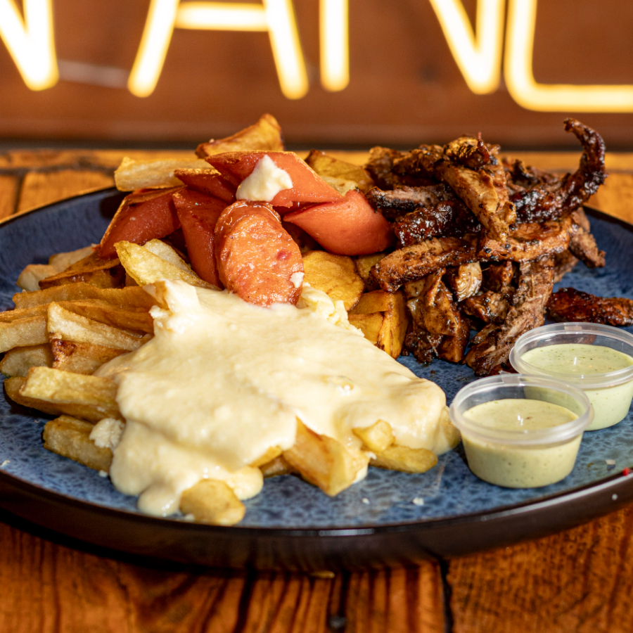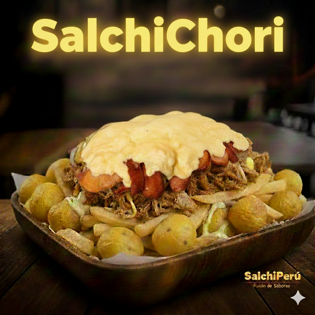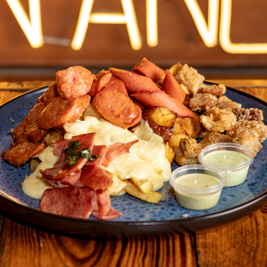 Papa amarilla y francesa crocante, salchicha, costilla ahumada en trozos, queso gratinado acompañado de salsa y ají de la casa.