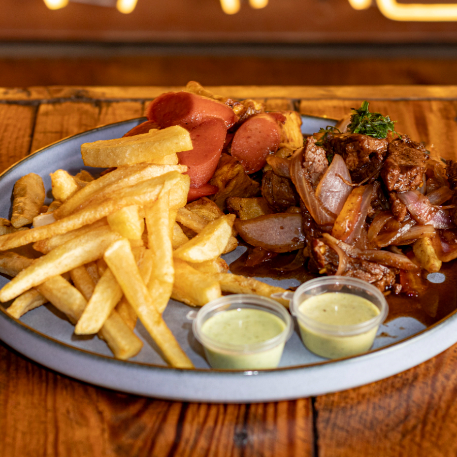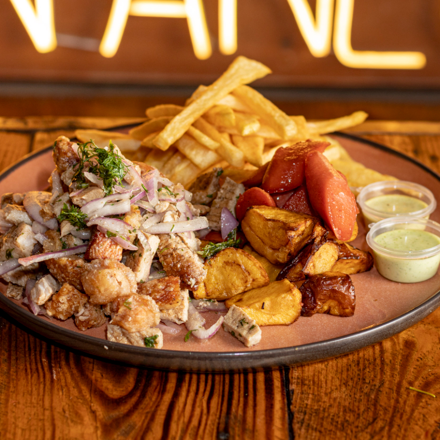 Pollo crocante, papa amarilla y francesa, un toque de queso gratinado. Clásico, contundente y delicioso acompañado de salsa y ají de la casa.