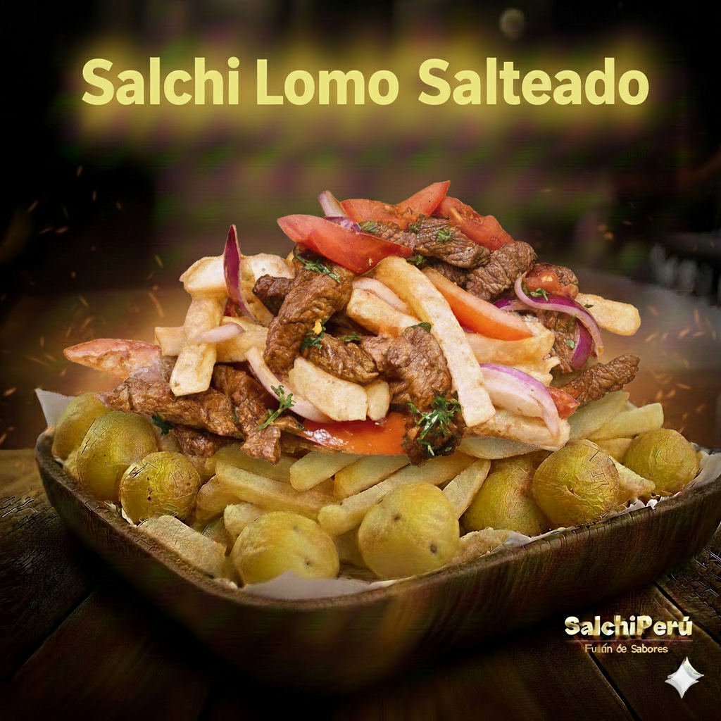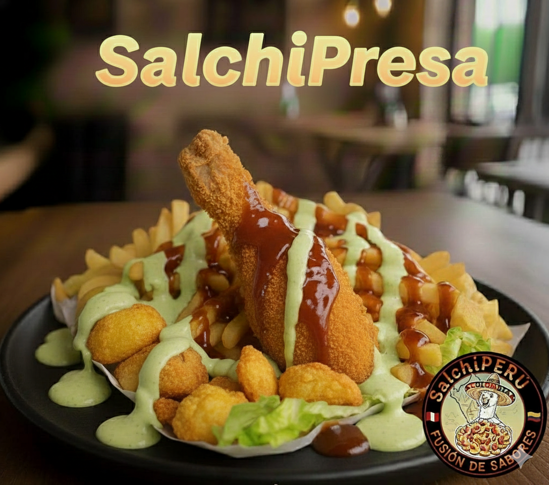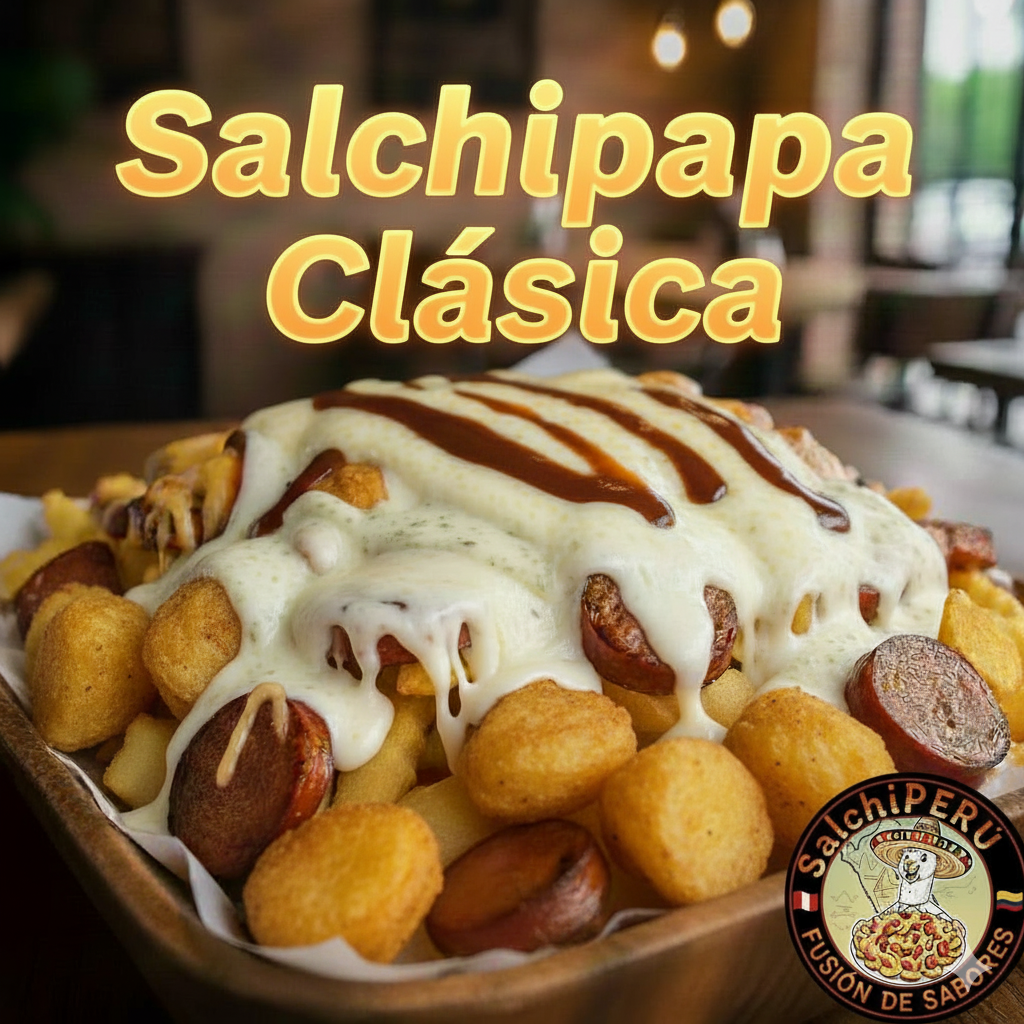 Salchipapa personal de papa amarilla, papa a la francesa, salchicha, Carne de res, cebolla morada, tomate, aliños peruanos, acompañado de salsa y ají de la casa.