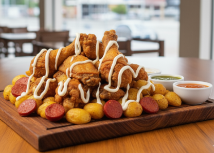 Presa de pollo (Ala), salchicha, papa, salsas al gusto.