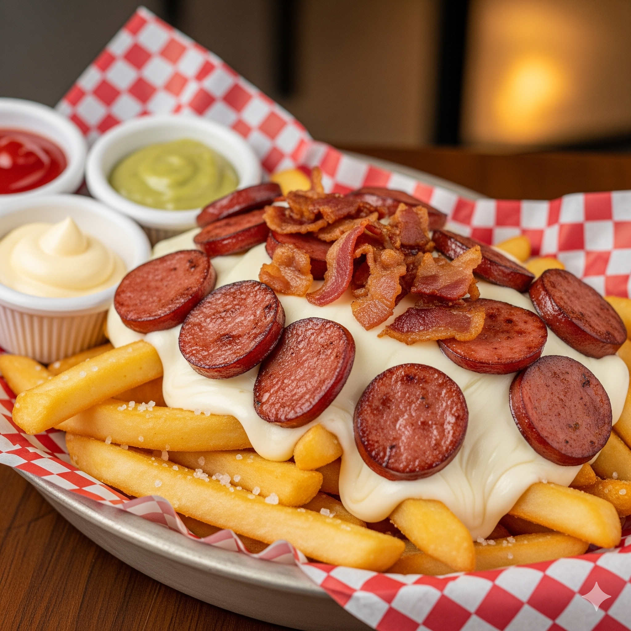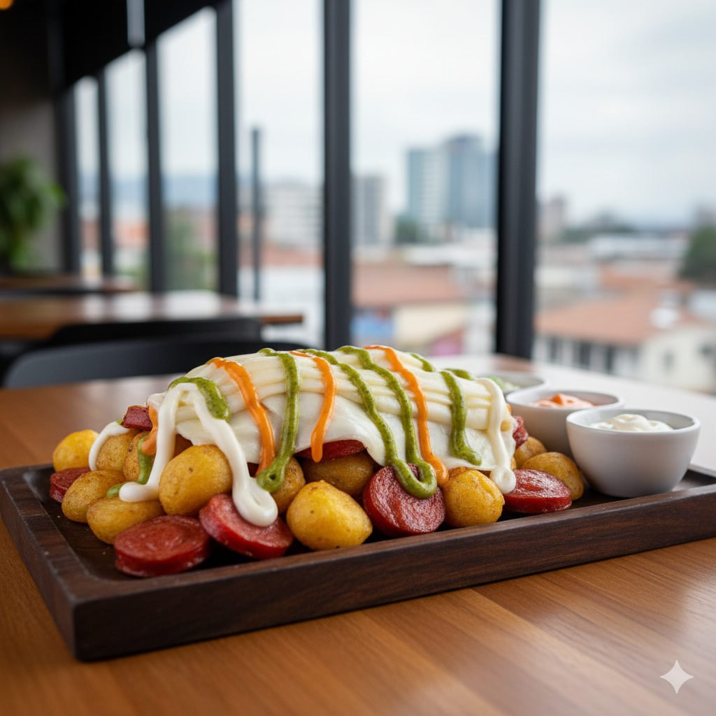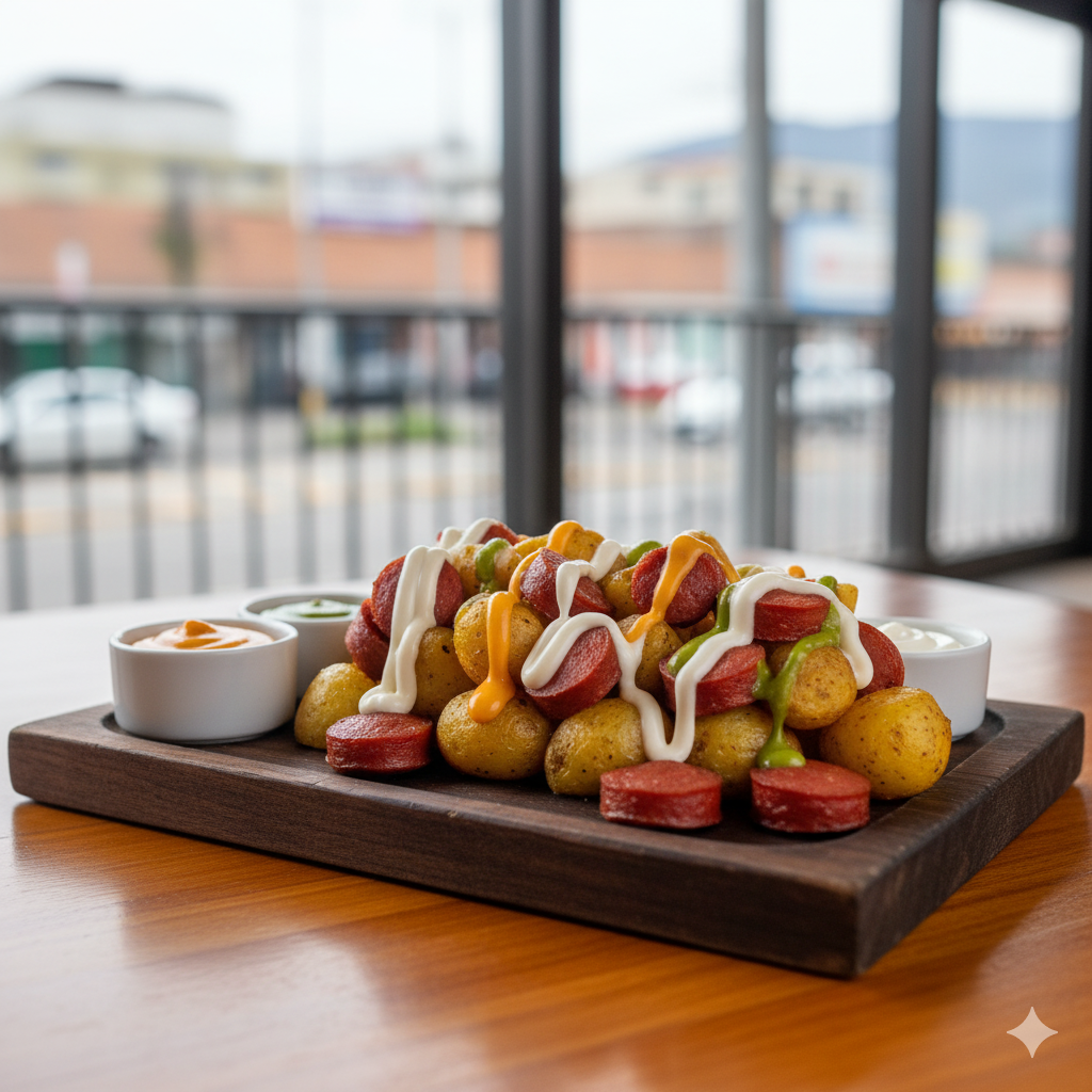 Salchicha, papa, queso gratinado y salsas al gusto para 2 personas.