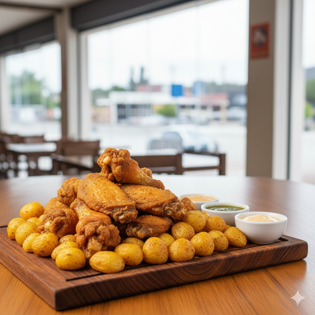 Presa de pollo (Doble Ala), salchicha, papa, salsas al gusto.